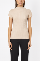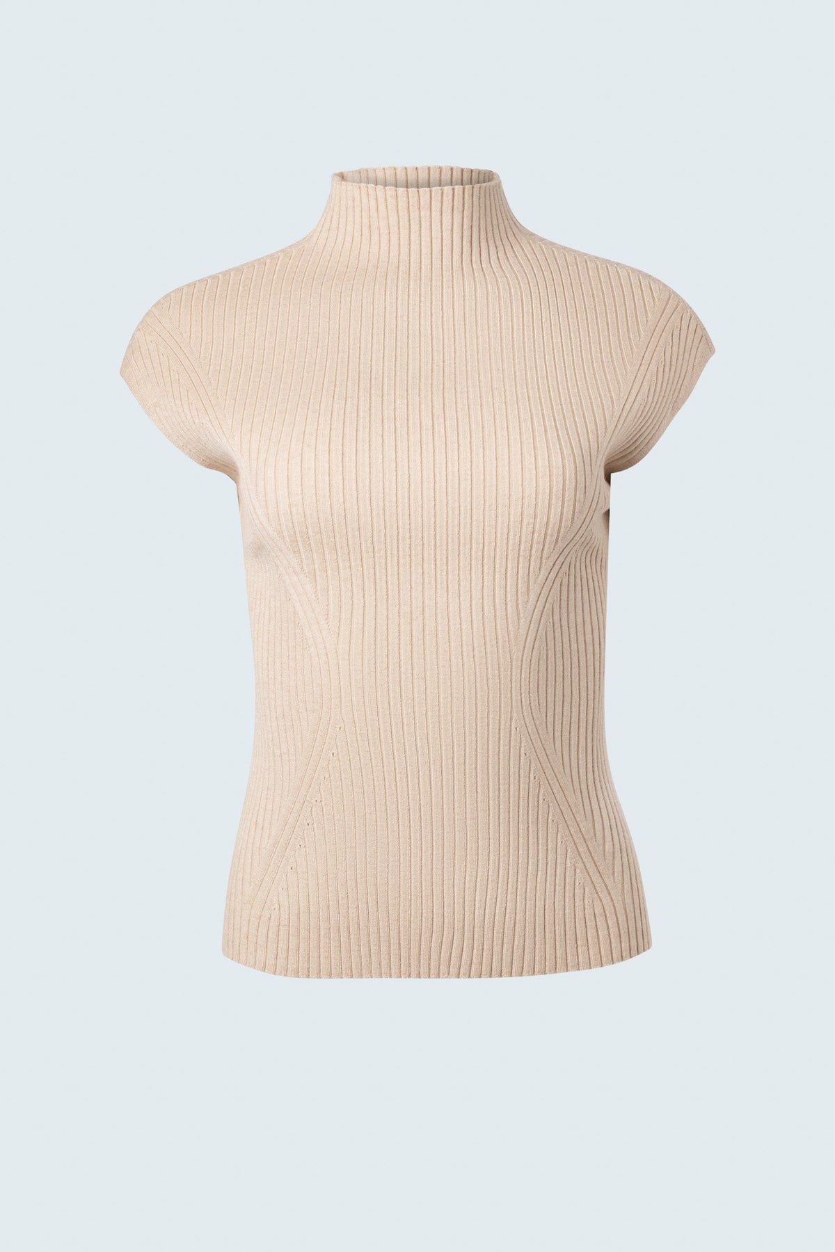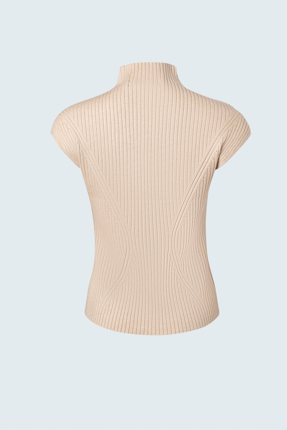 This sleeveless ribbed top features a refined stand-up collar, offering a sophisticated layer for transitional weather. Its delicate pointelle detailing adds subtle texture, making it versatile enough to wear alone or layered under jackets. Crafted in a soft bone hue, it pairs effortlessly with jeans or tailored pieces, elevating your wardrobe with understated elegance and expert craftsmanship.