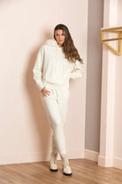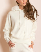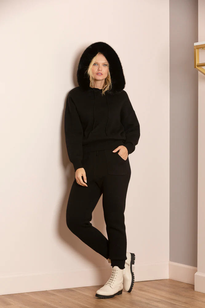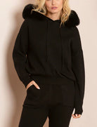 Cozy wool-blend hooded sweater with detachable genuine fur trim in black and ivory.