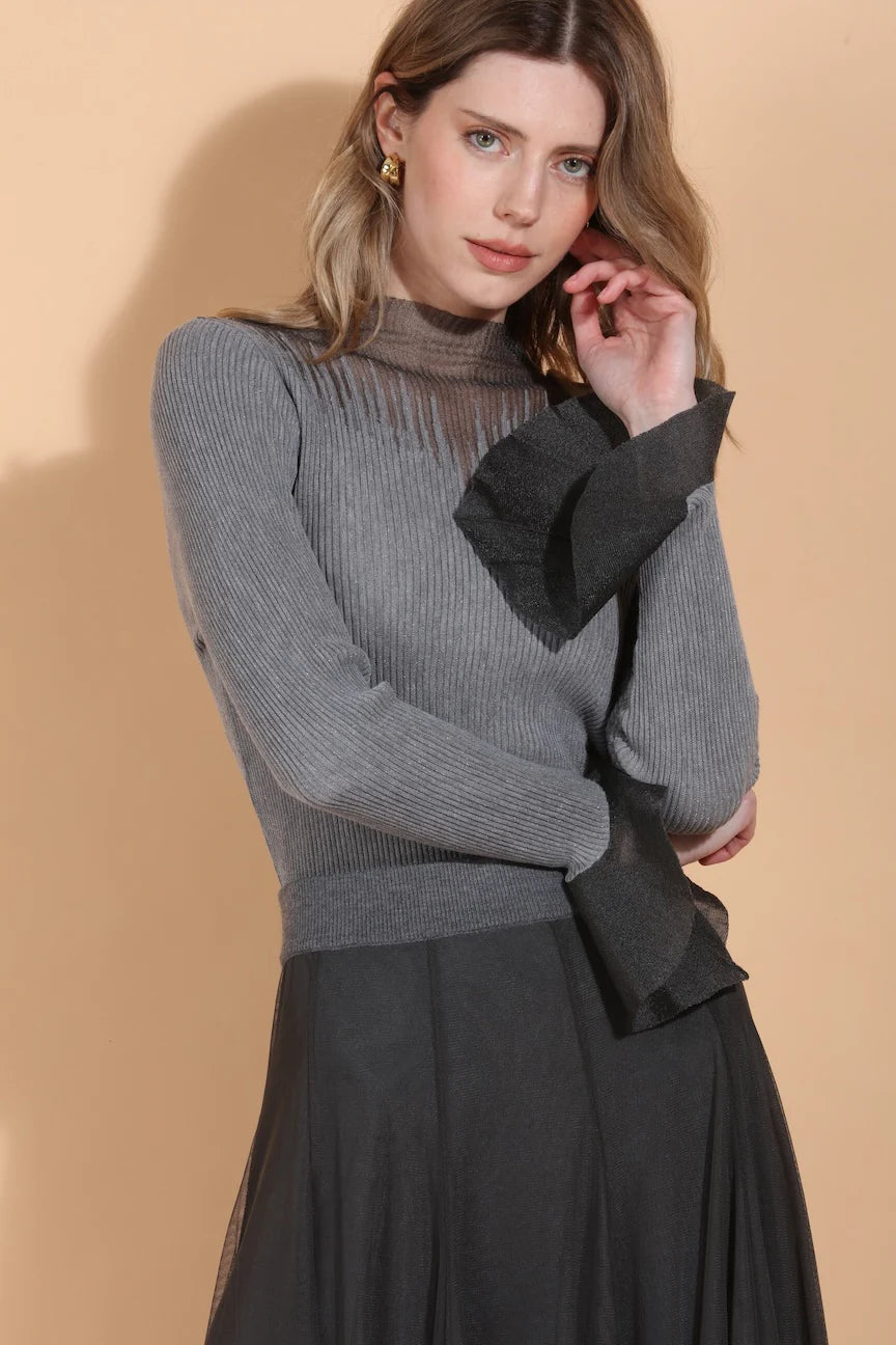 Sheer Mock Neck Lightweight Knit Top with Cuffs
