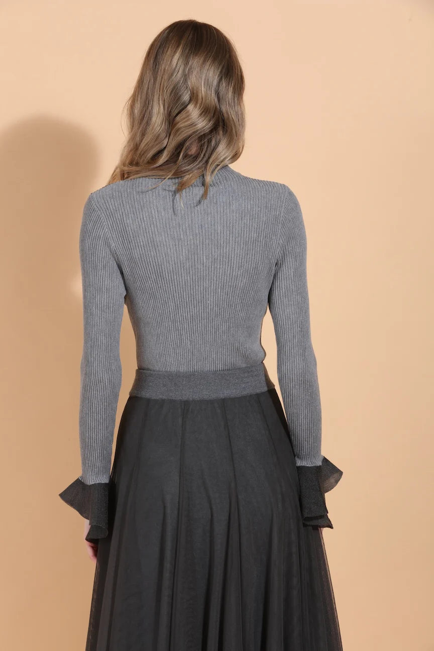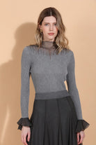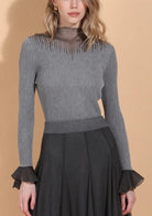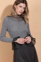 Chic sheer mock neck lightweight knit top featuring feminine peplum cuffs. Perfect for layering or effortless day-to-night style.
