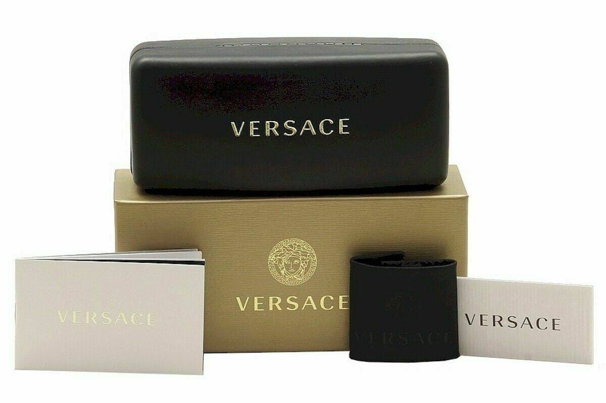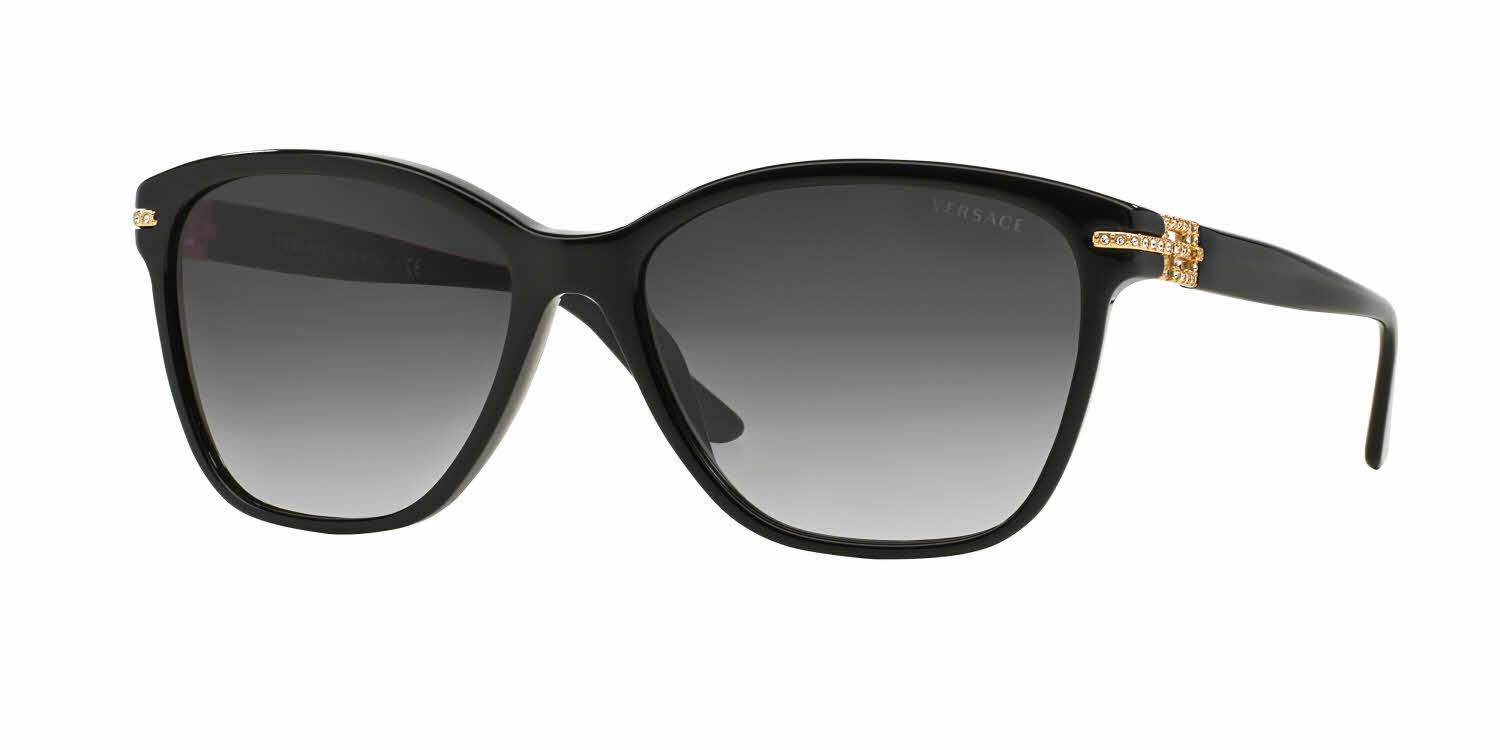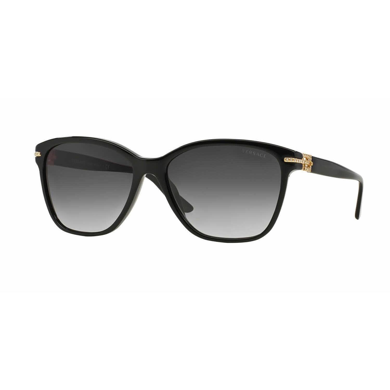 Versace 57mm Sunglasses with Black Frames and Grey Lenses - VE4290BGB18G57 Complete your chic look with this sophisticated squared-shape pair of sunglasses from Versace. As part of the Fall/Winter 2014 Bright Crystal Special Project, this acetate frame features nylon temple tips and 62 Swarovski crystals. The new Greca decor is inspired by the latest Versace fashion jewelry collection.