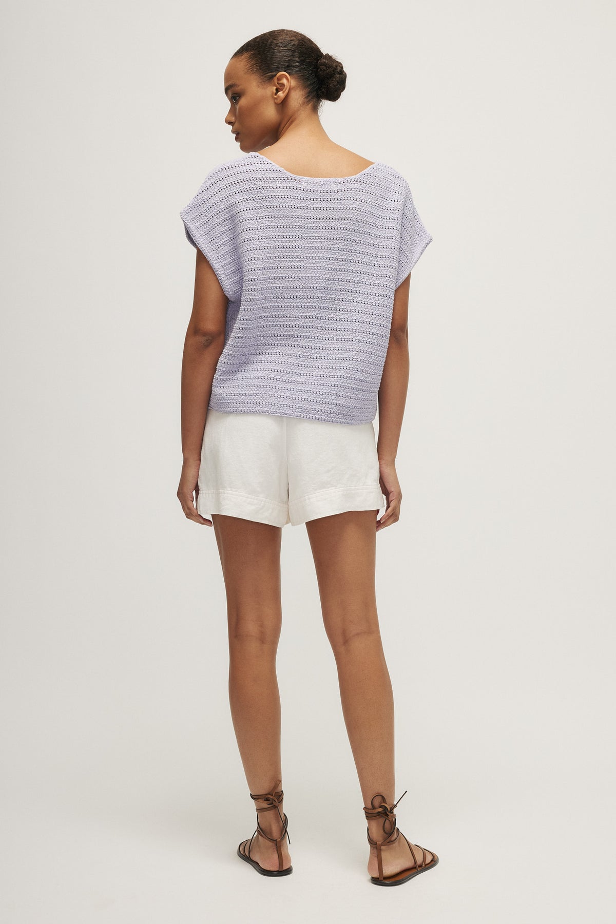 The Harlan Knit Sweater in Lavender is the epitome of breezy elegance and timeless sophistication. Its delicate, open-knit design adds a touch of relaxed luxury to any warm-weather outfit.