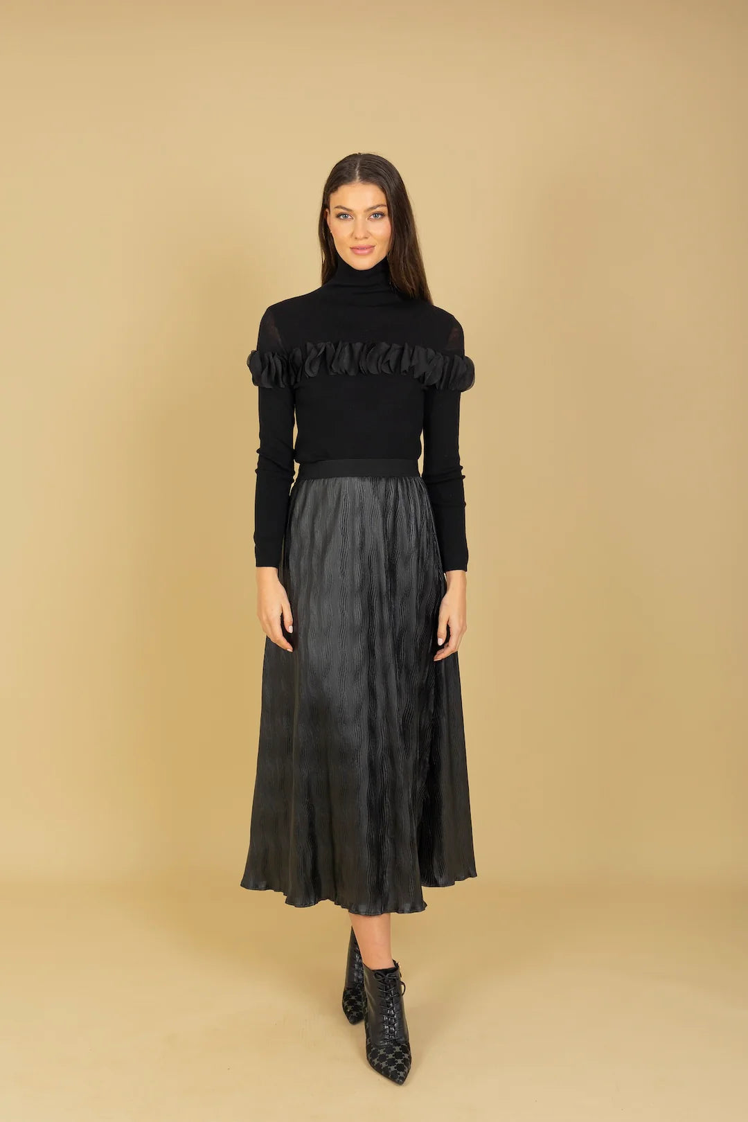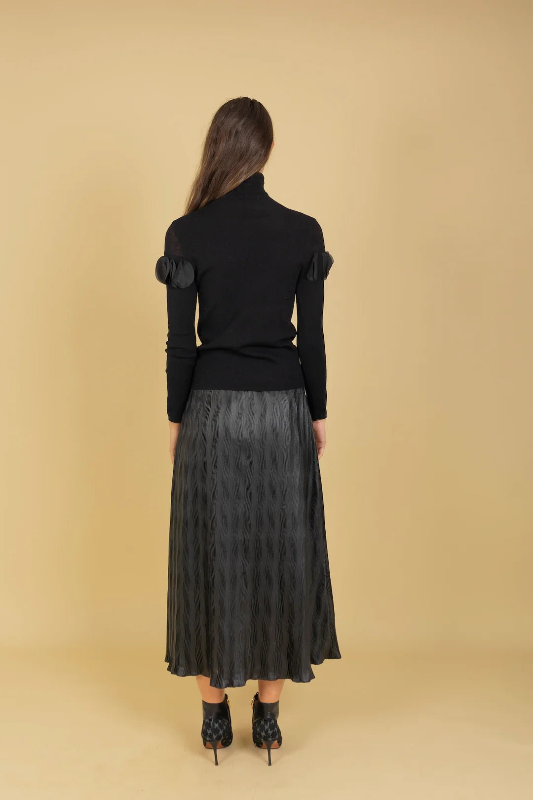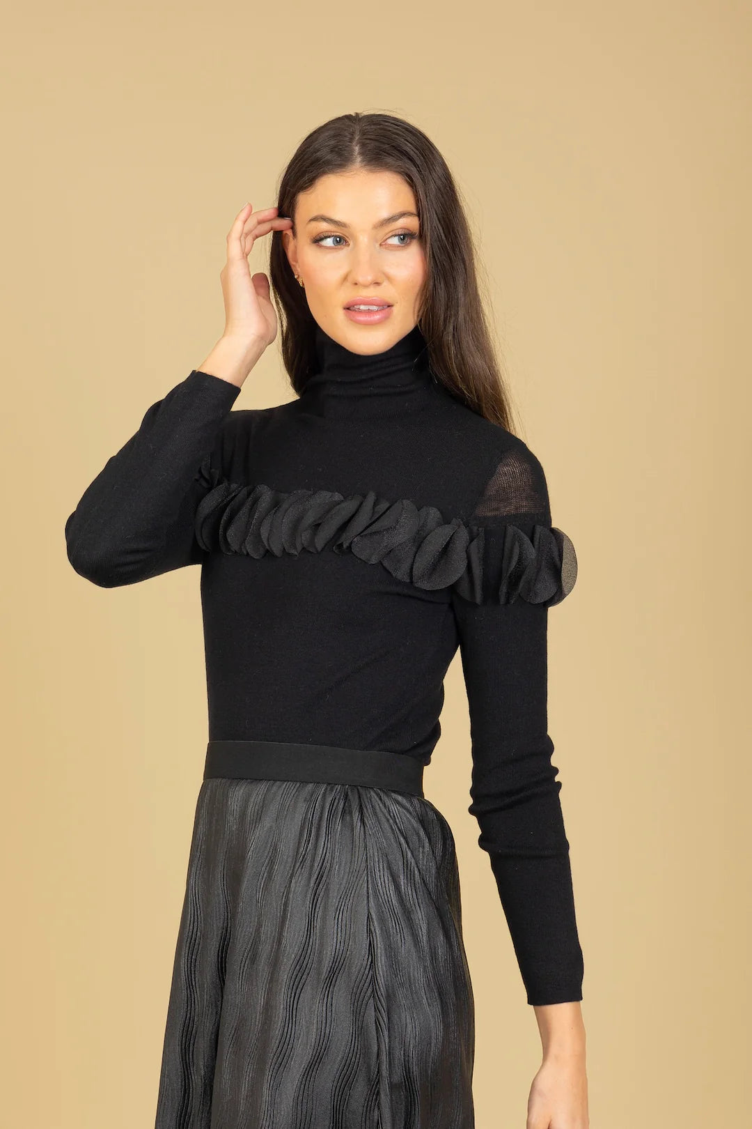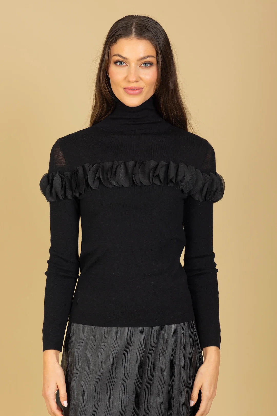 Luxurious 100% merino wool turtleneck sweater adorned with elegant appliqué detailing. Warm, soft, and effortlessly stylish.
