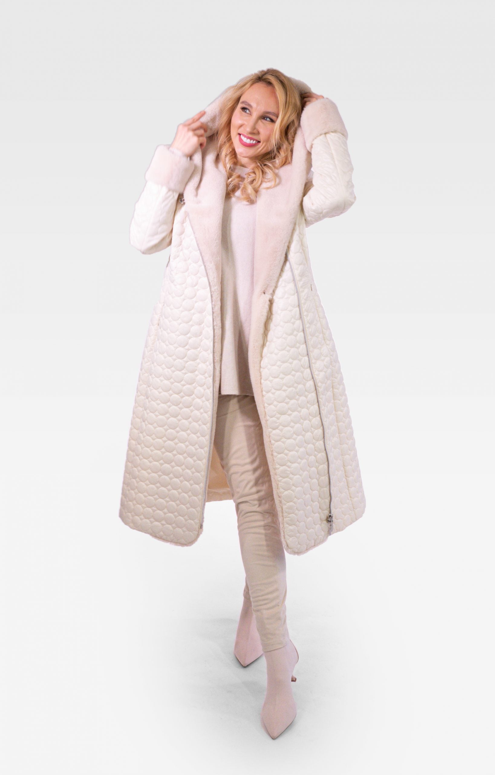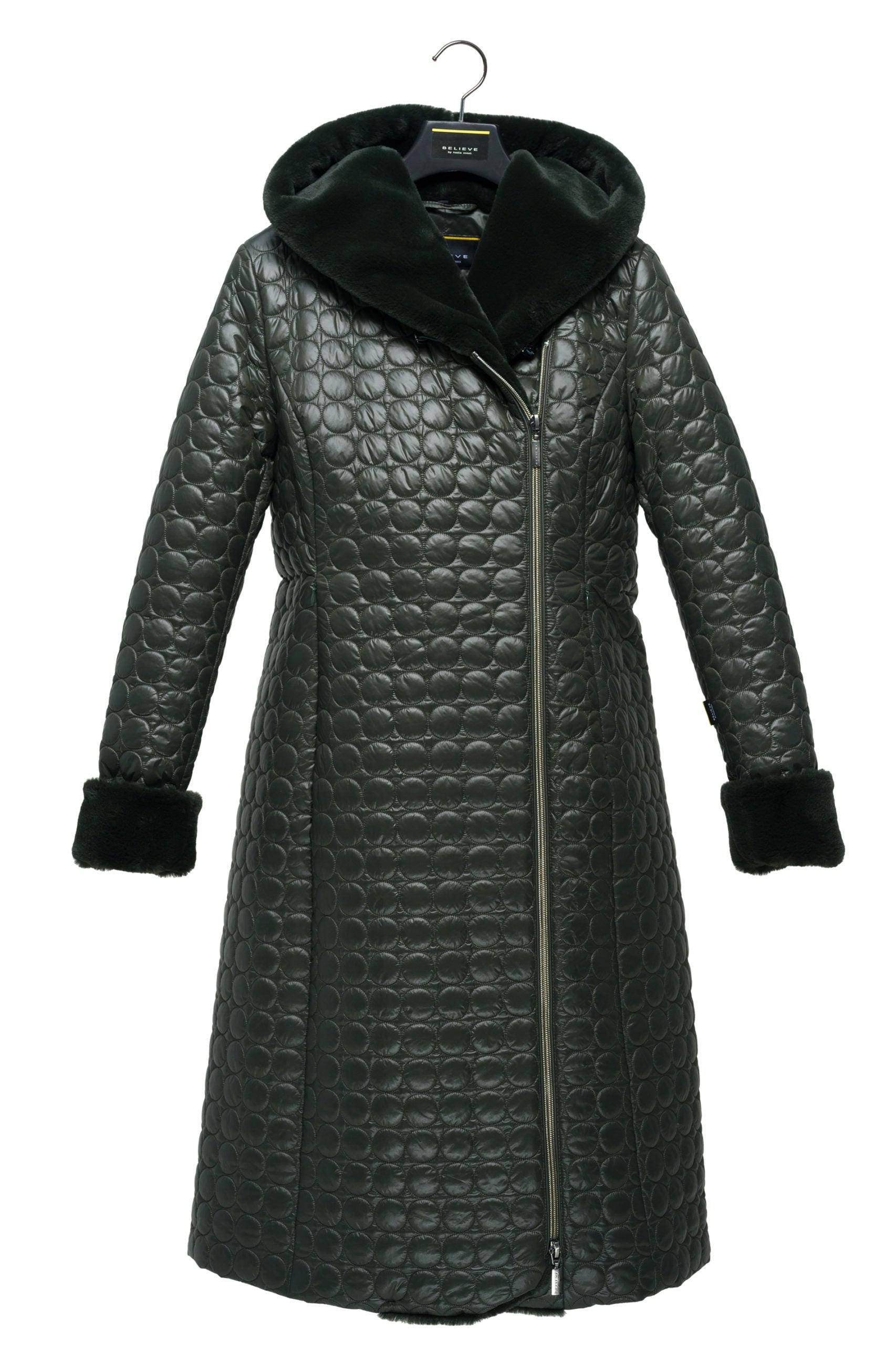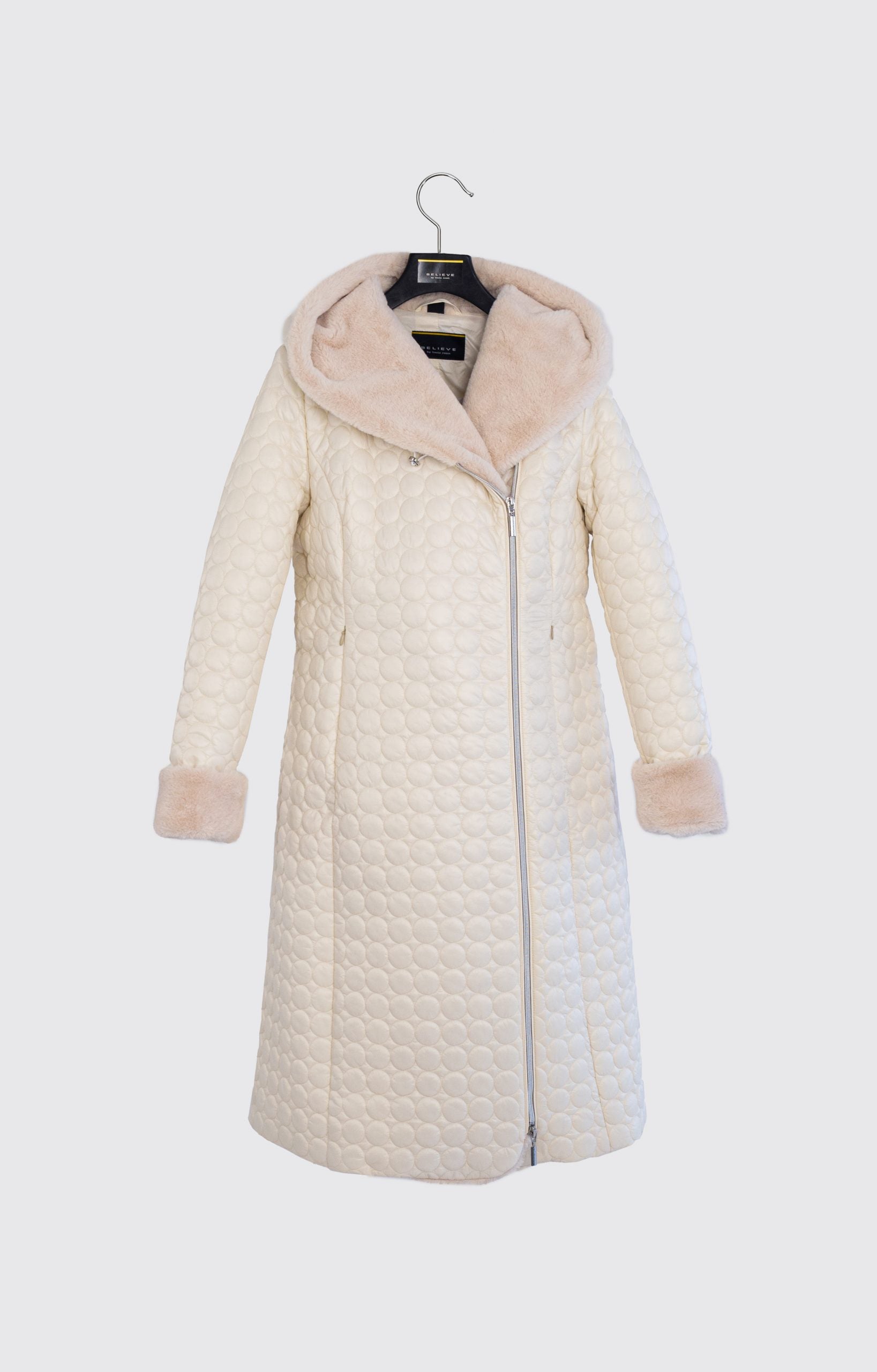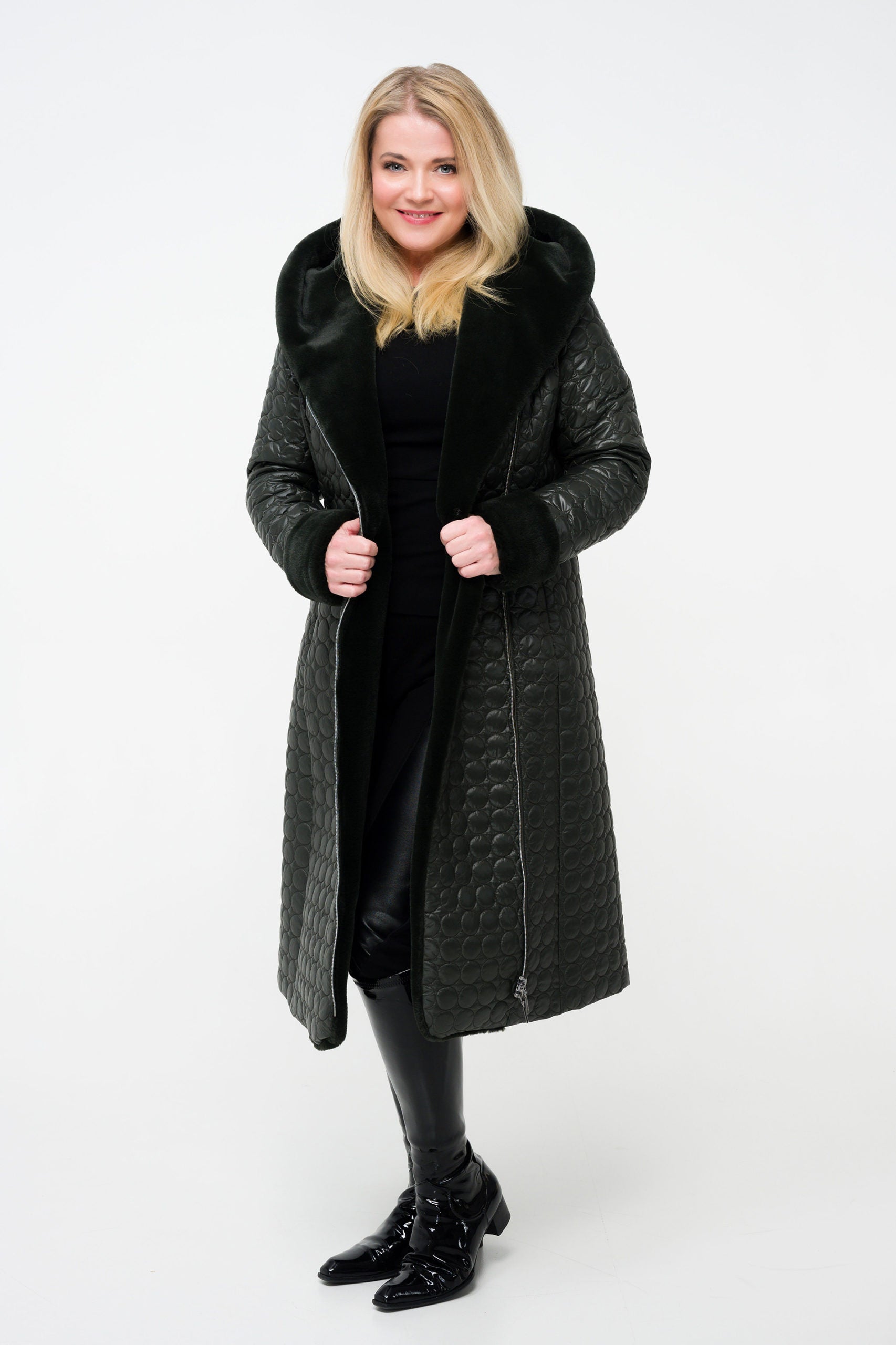 This Jade Quilted Coat with Fur combines sophisticated design with practical warmth. Crafted from quilted material, it features a soft, fluffy fur lining on the front and inside the adjustable hood for added comfort. The hidden zippered pockets also offer a touch of luxury with fur-lined interiors.