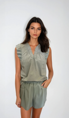 The Melissa Nepton Hudson Short in sage is effortlessly cool and stylish. With an elastic waist and side pocket, it offers both convenience and comfort. The faux leather adds an edgy touch, making it perfect for a fun night out!