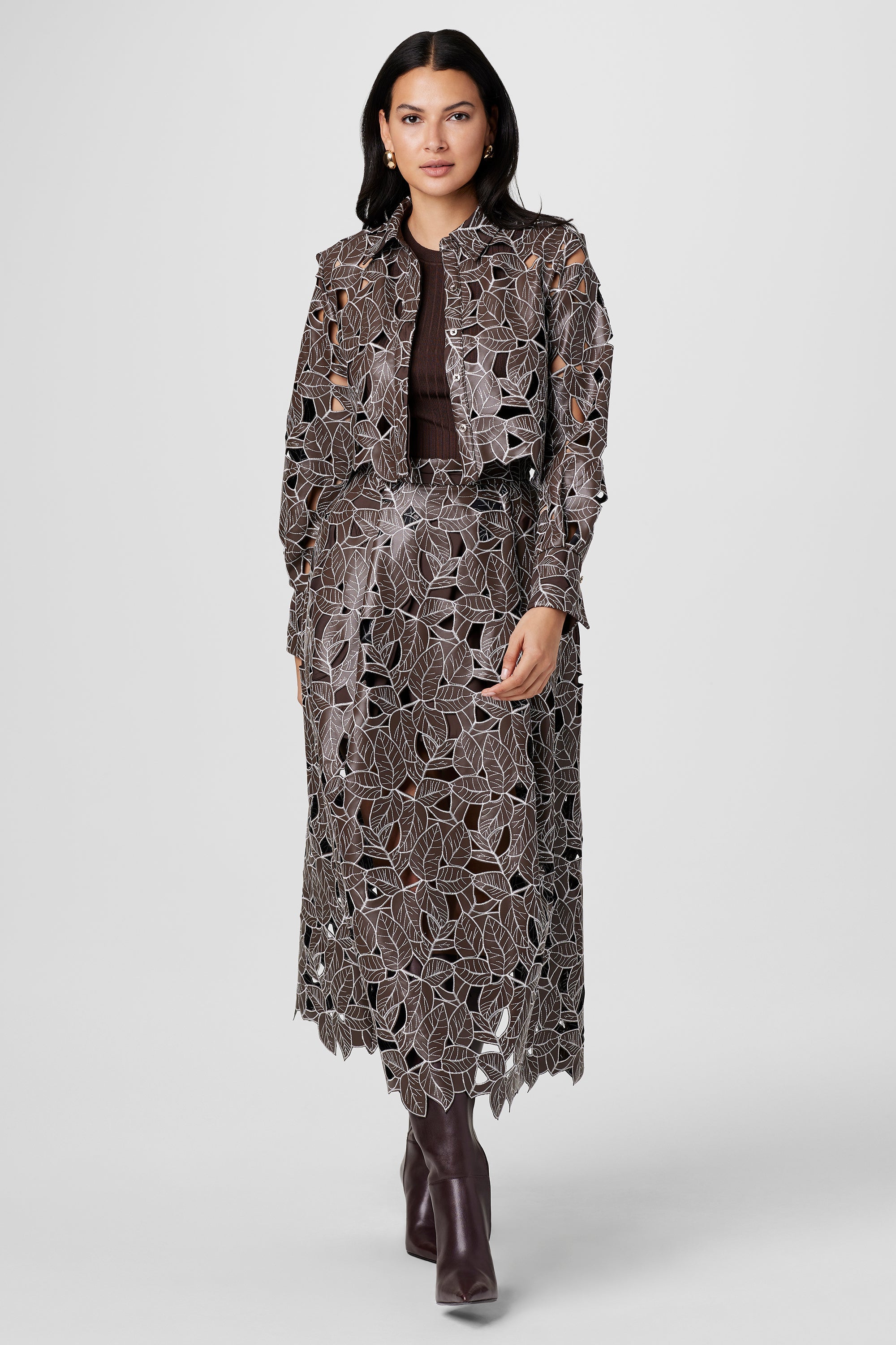 The Stacy Lace Skirt in Espresso/Ivory is an expertly crafted midi skirt perfect for fall. Made from soft vegan leather with detailed embroidery, it introduces a luxurious texture to your wardrobe. The exclusive lace pattern enhances the skirt’s volume, allowing it to drape elegantly away from the body for a flattering fit.