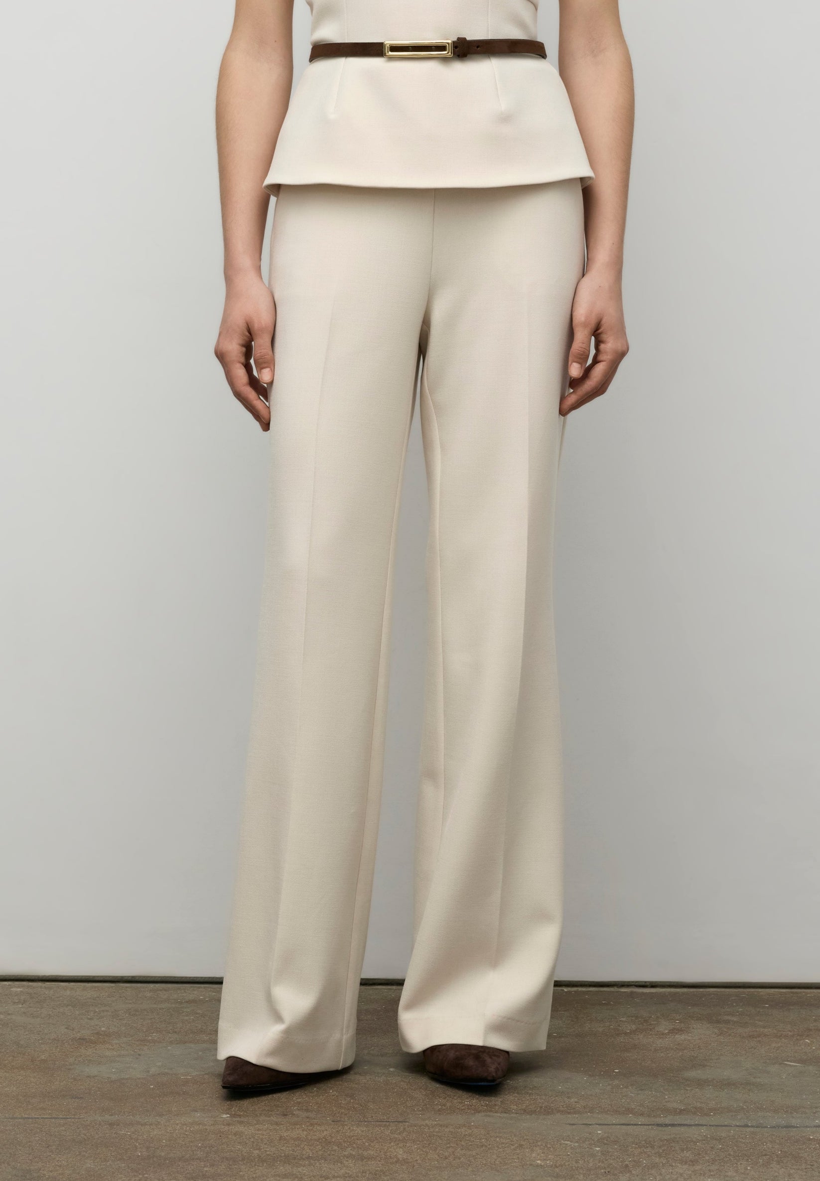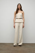 These bone-colored wide leg pants are expertly designed to combine comfort with a sleek, modern silhouette. The wide cut allows for unrestricted movement while maintaining a tailored appearance, making them suitable for both professional and casual wear. Their neutral tone offers versatile styling options, ensuring a polished look in any setting.