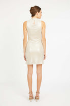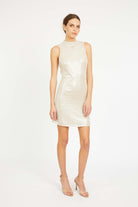 The Rayne Dress in Silver Sequin offers a sophisticated edge with its sleeveless cut and high neckline. Crafted to accentuate the silhouette, this mini dress is fully adorned with shimmering silver sequins, ensuring a striking presence. Ideal for upscale events and celebrations, it delivers a refined yet bold look that captivates attention.