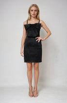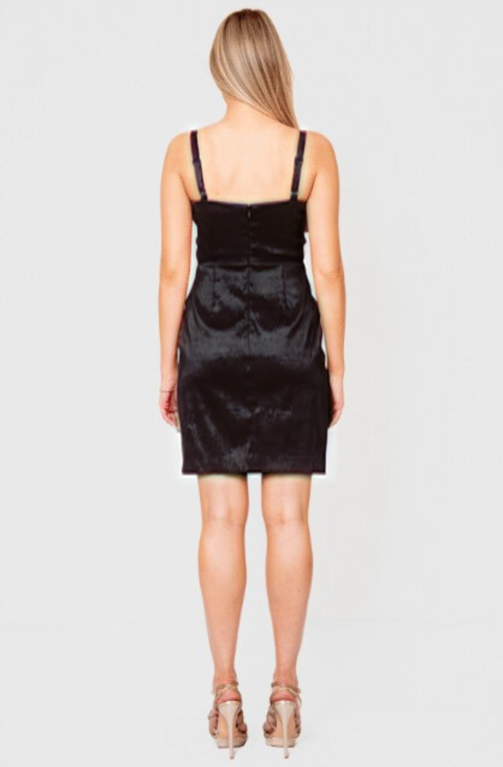 This mini dress is effortlessly chic with a playful twist. The black color is sleek and versatile, while the bow detail adds a touch of fun. Perfect for any occasion, this dress will make you stand out with its unique design.