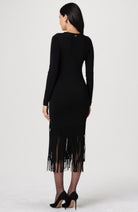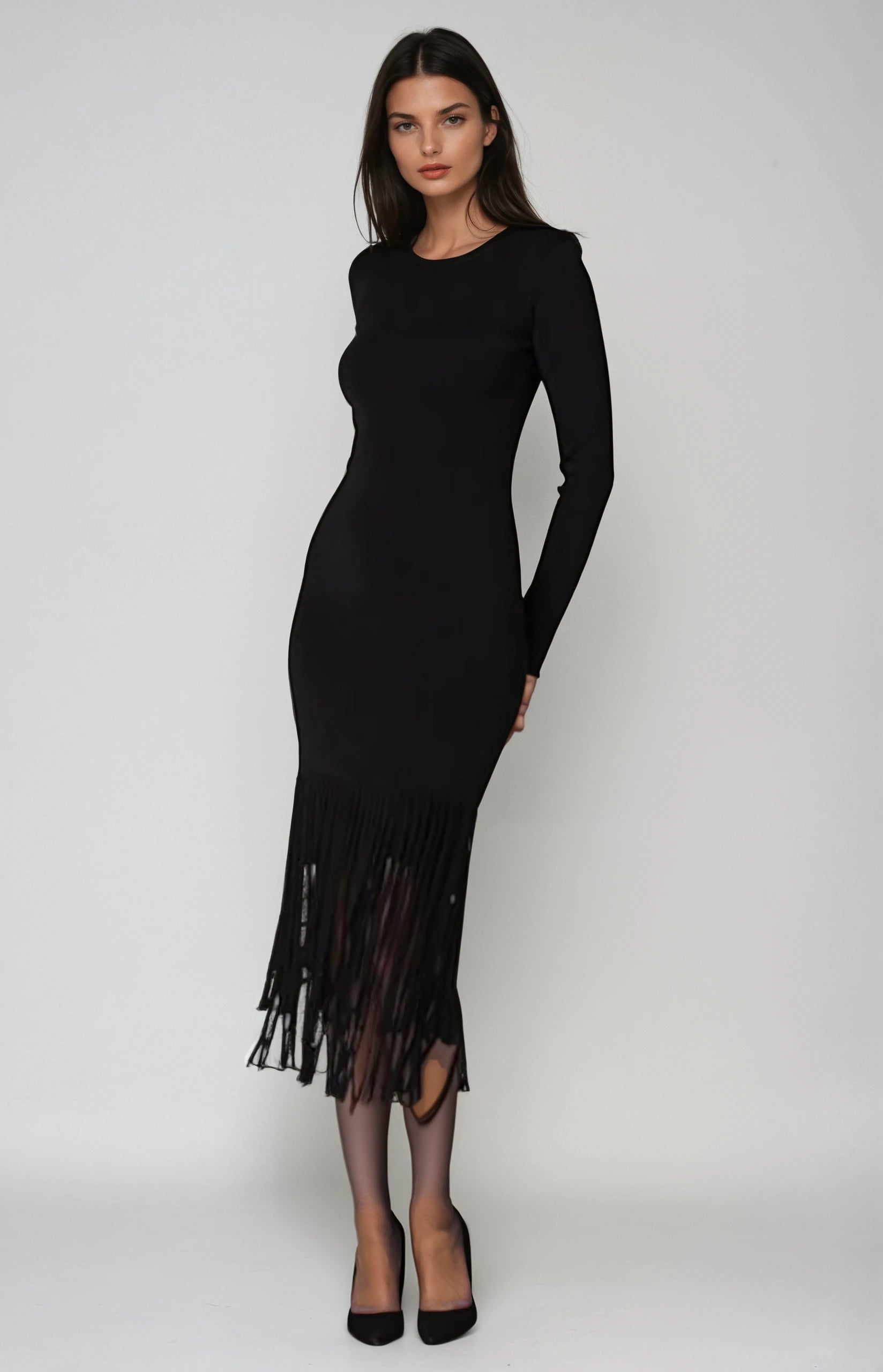 The Darby Long Sleeve Fringe Midi Dress combines sophisticated design with dynamic movement. Featuring long sleeves and a flattering midi length, this dress is detailed with delicate fringe accents that add texture and fluidity. Ideal for events where elegance meets a touch of playful flair, it offers both style and comfort for confident wear throughout the day or evening.