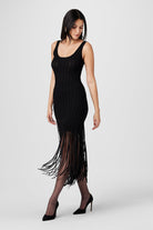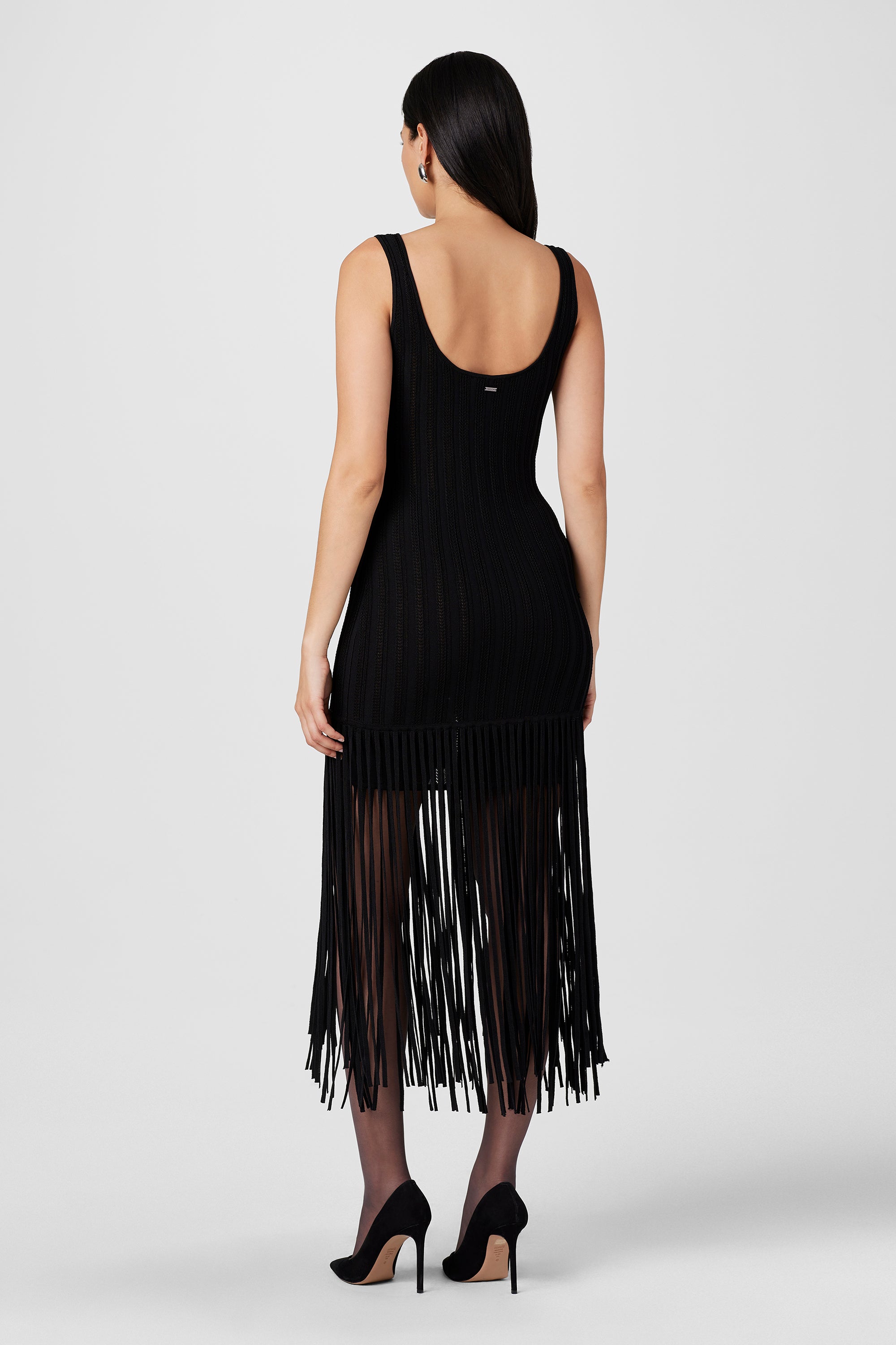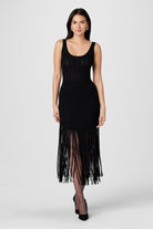 The Lorelai Scoop Neck Fringe Dress in Jet is expertly crafted to accentuate curves with its fitted silhouette and elegant scoop neckline. Its standout detail—a dramatic fringe hem—adds dynamic movement and sophistication. Made from a delicate pointelle knit, this dress combines texture and allure for a refined yet captivating look. Ideal for occasions that call for both style and comfort.