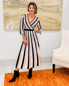 Turn heads in effortless style with the Nolita Dress. Designed with a flattering wrap-style top and a flowy A-line silhouette, this midi dress features bold vertical stripes that elongate your figure and create a timeless, sophisticated look. The ¾ sleeves and soft, lightweight fabric make it perfect for all-day wear—whether you’re at brunch, work, or an evening out.