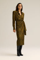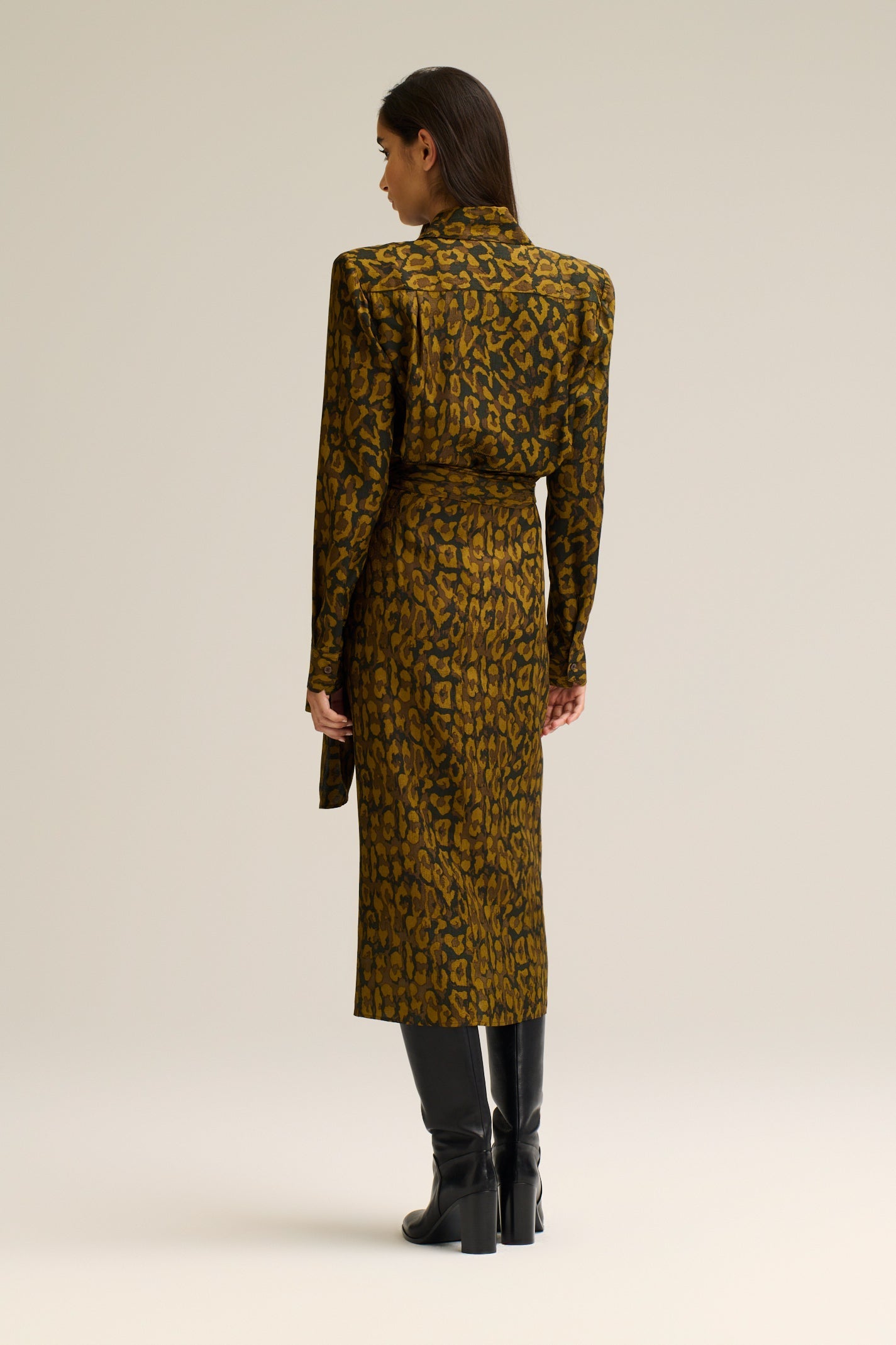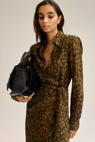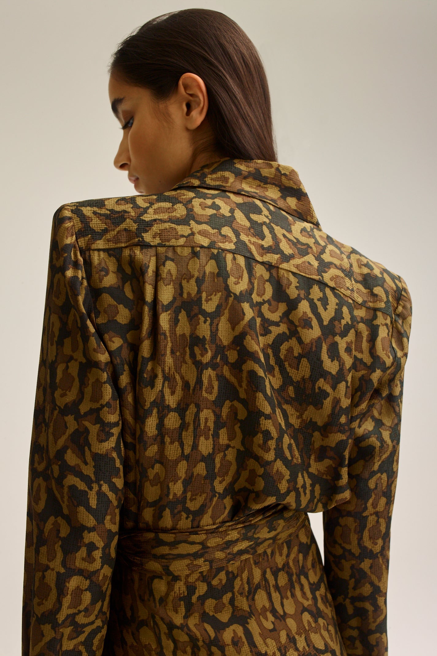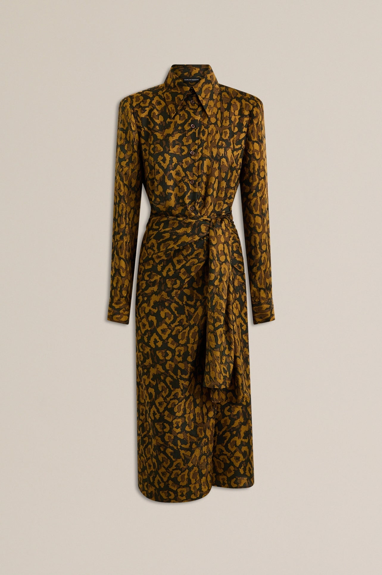 This dress, crafted from 100% silk jacquard, brings a refined silhouette enhanced by an elasticated waist and a coordinating tie belt for a tailored fit. Its minimalist V neckline and low-cut back with delicate shoulder ties offer subtle sophistication. Rendered in a timeless palette of chocolate, camel, and cream, the contemporary animal print adds an elegant yet modern edge. Perfect for those seeking a luxurious statement with intricate detailing and expert craftsmanship.