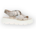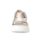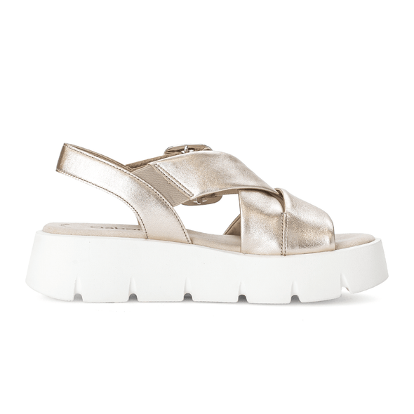 Make a statement with these Satin Metallic Sandals! Designed for women, these sandals feature Gabor Best Fitting for width F and a leather upper and lining. The padded insole with textile insert provides ultimate comfort. The ankle strap has a convenient Velcro fastener and the second cross strap has an elastic band for a secure fit.