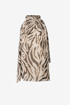 This sleeveless blouse showcases a high collar and striking abstract print, combining sophistication with modern style. The removable scarf adds versatility, allowing you to customize your look effortlessly for various occasions. Perfect for those seeking a contemporary yet polished wardrobe staple.