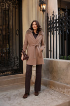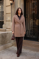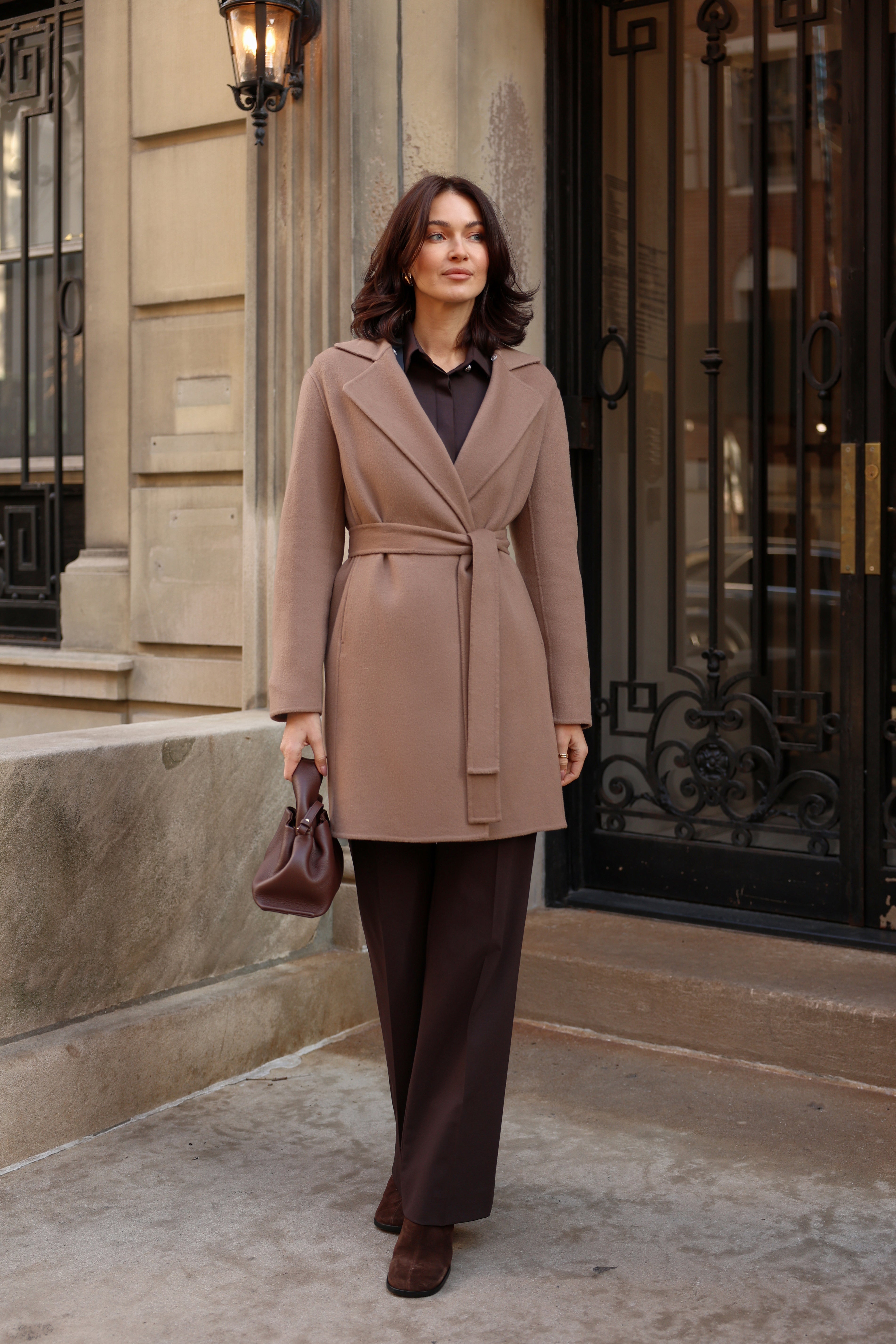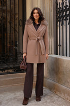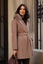 This coat is crafted from luxurious unlined double-sided cashmere wool. It features a wrap-inspired design, characterized by a wide and enveloping silhouette, a detachable fox collar, long set in sleeves, a lapel collar, and side inset pockets. Additionally, it includes a detachable fox collar for added versatility.