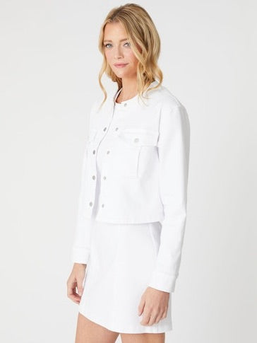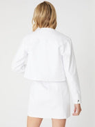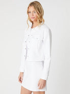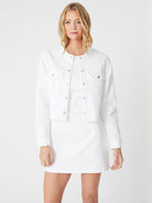 The Remi Crop Shirt Jacket in white denim offers a refined, contemporary silhouette with its cropped cut and crisp fabric. Designed to elevate your wardrobe, it layers seamlessly over sundresses or pairs effortlessly with high-rise jeans, delivering a clean and fresh aesthetic. This versatile piece combines structure and ease, making it an essential addition for those seeking a polished yet cool-girl vibe.