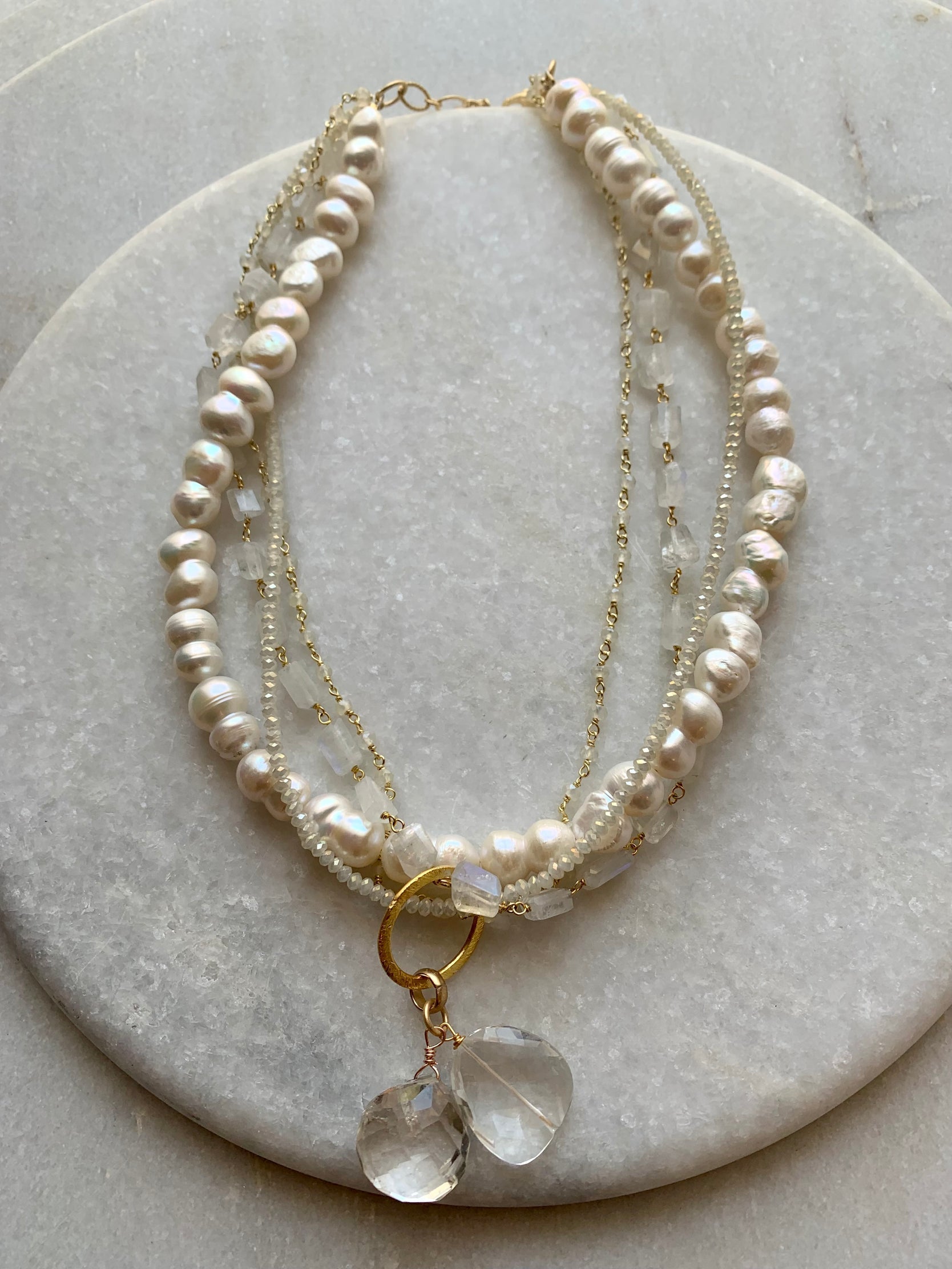 The Ivory Crystal Flaneur Necklace offers versatile elegance inspired by childhood memories of wandering and collecting treasures. Handcrafted in Santa Fe, this piece features semi-precious stones on a gold-finished chain, designed to be worn two ways: as an 18" choker with four distinct strands or separated into two sets for a 36" length. Each necklace carries unique variations, making it a truly individual expression of timeless style.