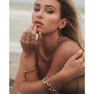 The Jenna Link Bracelet is a striking accessory that stands out with its bold, thick links. Perfect on its own or layered with other gold or silver pieces, it adds a touch of playful sophistication to any outfit. Its versatile design makes it an essential piece for elevating your everyday style effortlessly.