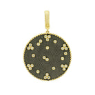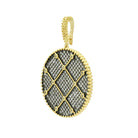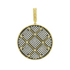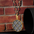 - This pendant style is designed with criss-cross cubic zirconia stones on one side, inspired by the railroad tracks in Brooklyn. The reverse side features a textured black rhodium surface embellished with cubic zirconia clovers and single stones bezel-set in 14k gold, inspired by the manhole covers in Brooklyn