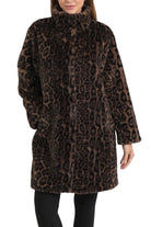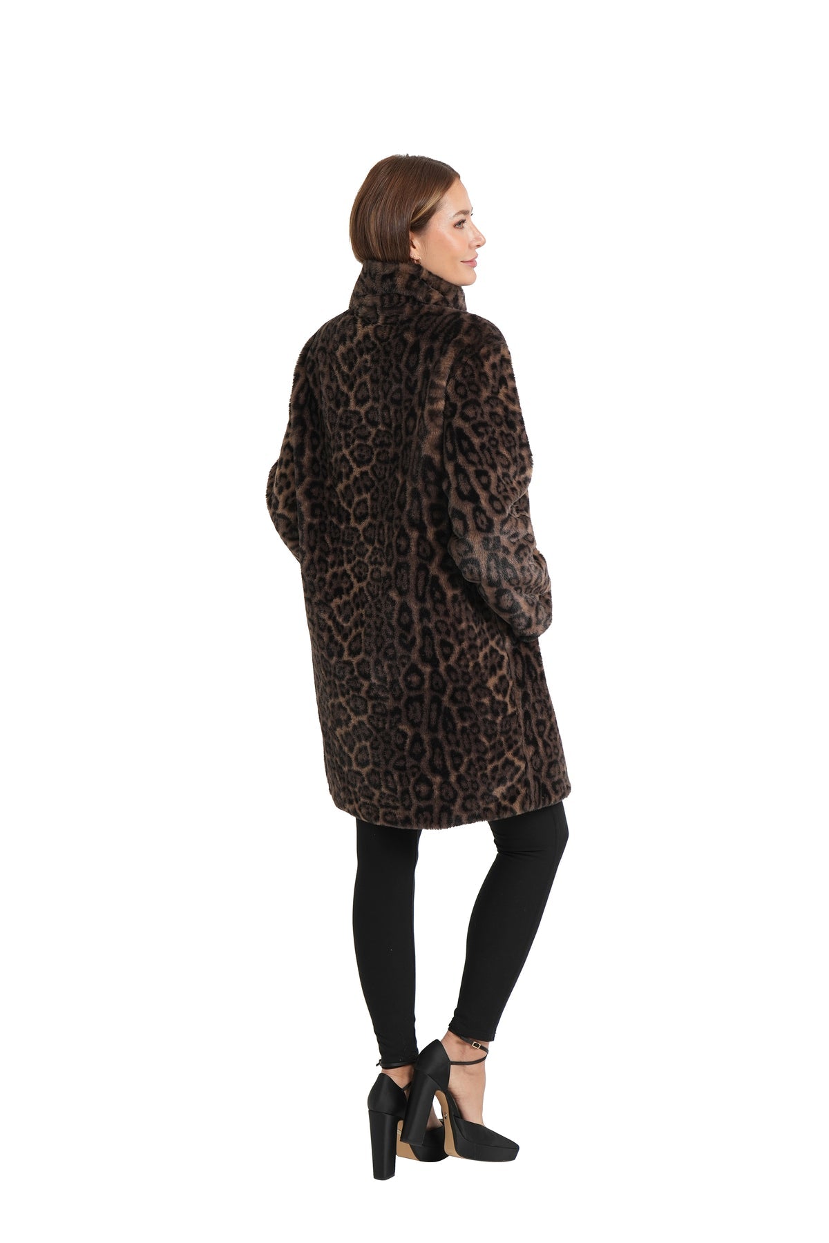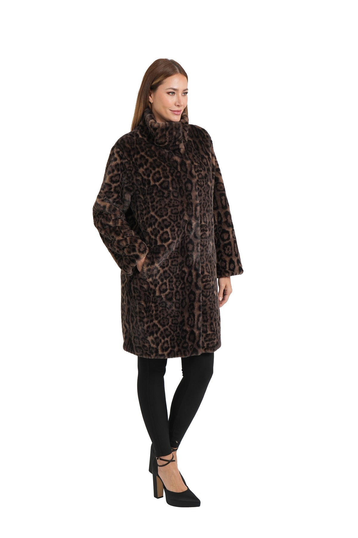 This Zion Long Leopard Faux Fur Coat features a sophisticated stand collar and a secure front hook and eye closure for a polished look. Designed with slit pockets on the front for practical style, it is fully lined to ensure comfort and durability. The relaxed fit provides ease of movement while maintaining a chic silhouette, making it an ideal statement piece for cooler seasons.