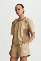 The Inti Top in Tan features a short-sleeve crochet design that blends craftsmanship with breathable comfort. Its intricate pattern enhances airflow, making it ideal for layering or warm-weather wear, while the neutral tan shade offers versatile styling options for a refined and casual look.