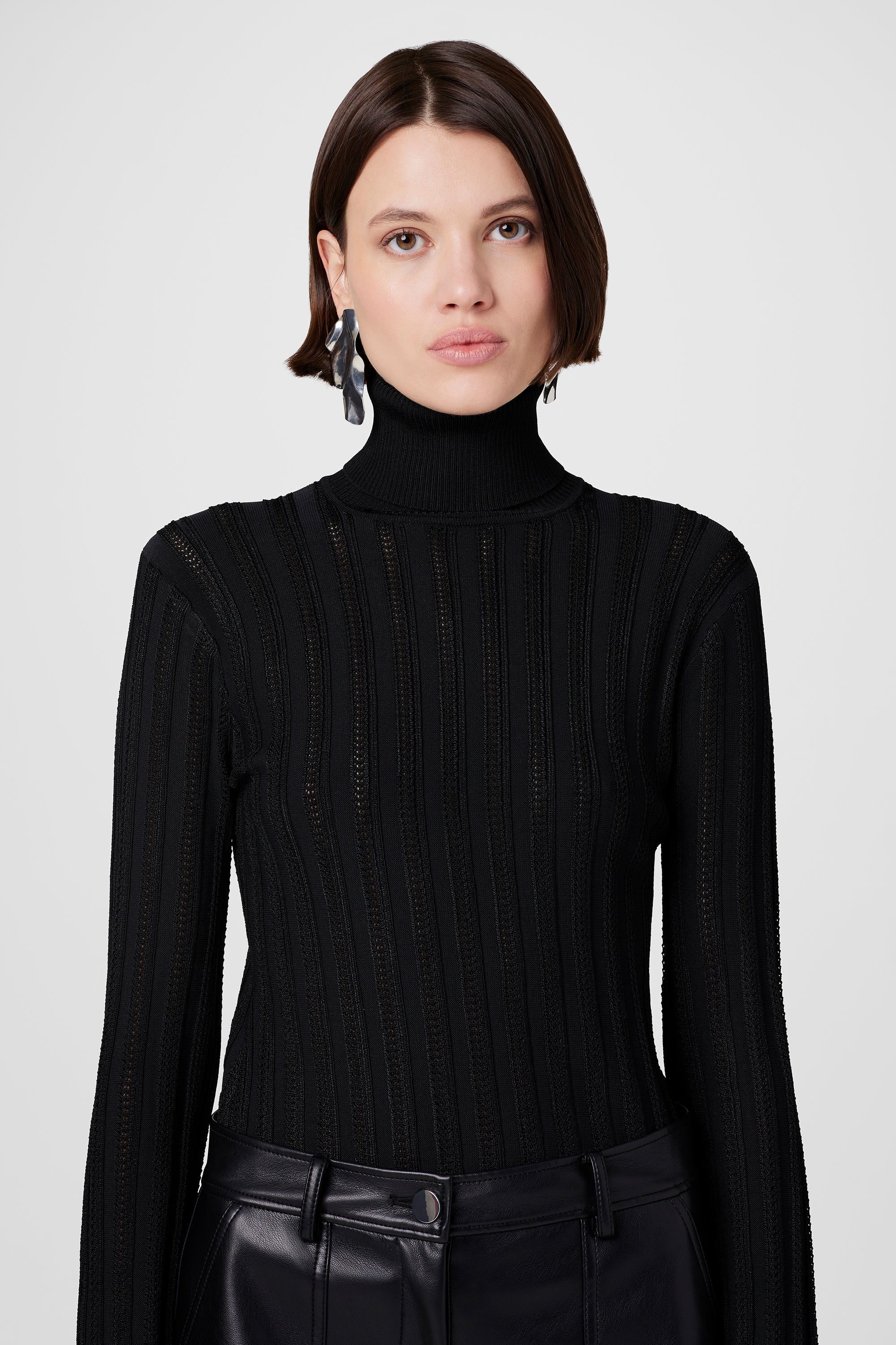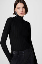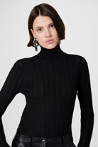 The Nancy Turtleneck Top features a sheer ribbed knit that contours smoothly to your body, creating a sleek, second-skin fit. Its delicate texture adds subtle sophistication, making it versatile to wear alone for a striking look or layered for a polished, contemporary style. This piece effortlessly blends modern elegance with understated detail, perfect for elevating any wardrobe.