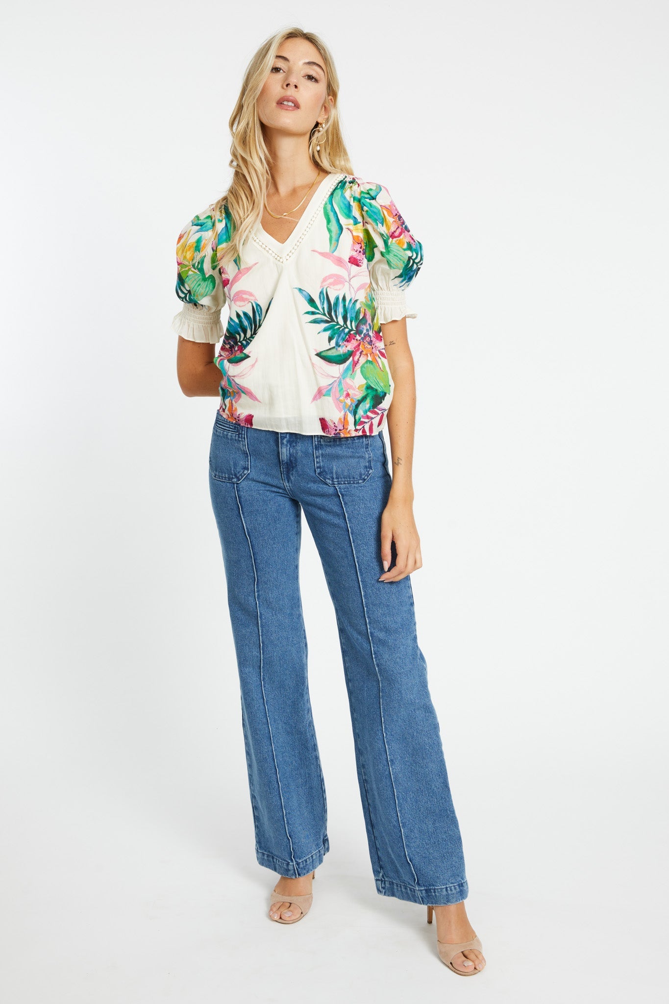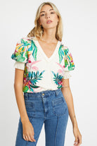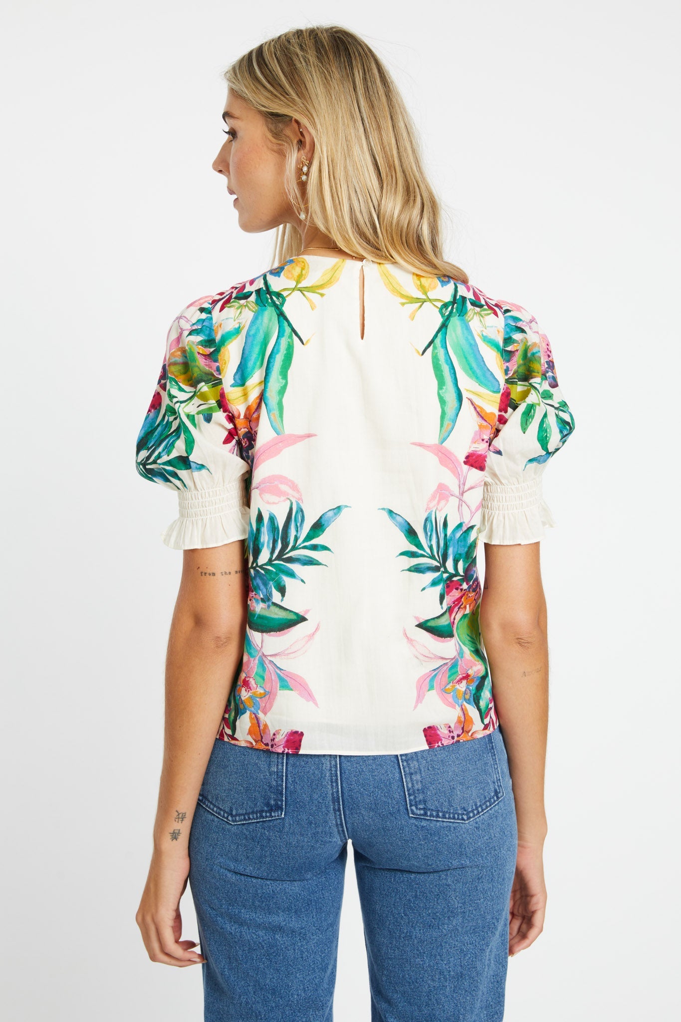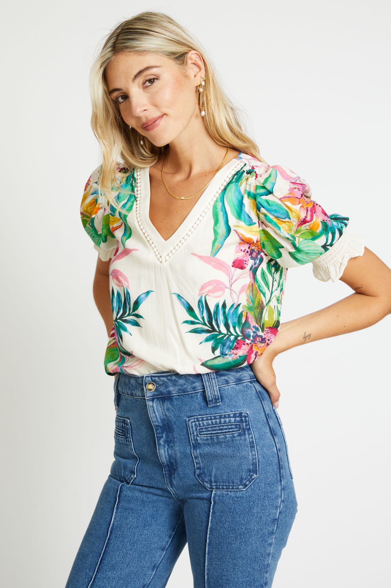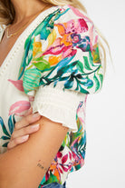 The Noha Top brings summer fun to your wardrobe with its breezy 100% Tencel fabric and eye-catching Amakhala print. Playful puff sleeves and a carefree V-neckline (complete with flirty lace trim!) create the perfect balance of comfort and charm. The dreamy pattern showcases a garden party of blue, green, and pink foliage dancing across a crisp white background – just the splash of joy your closet's been craving!