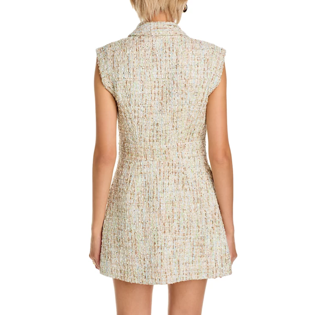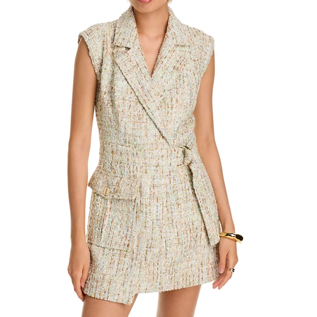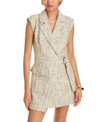 The Everly Safari Wrap Dress by TOCCIN is a refined choice for warm days, blending style and function seamlessly. Crafted from a textured ice blue tweed with a smooth polyester lining, this sleeveless mini dress features a notched collar and an A-line silhouette, flattering every figure. The adjustable D-ring belt allows for a custom fit, while the front cargo pocket adds a practical edge. At approximately 33 inches in length, this versatile piece transitions effortlessly from professional settings to evening occasions, making it ideal for spring wardrobes.