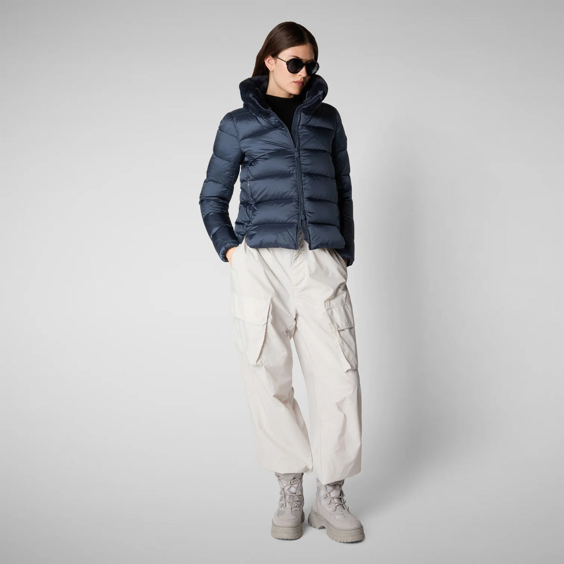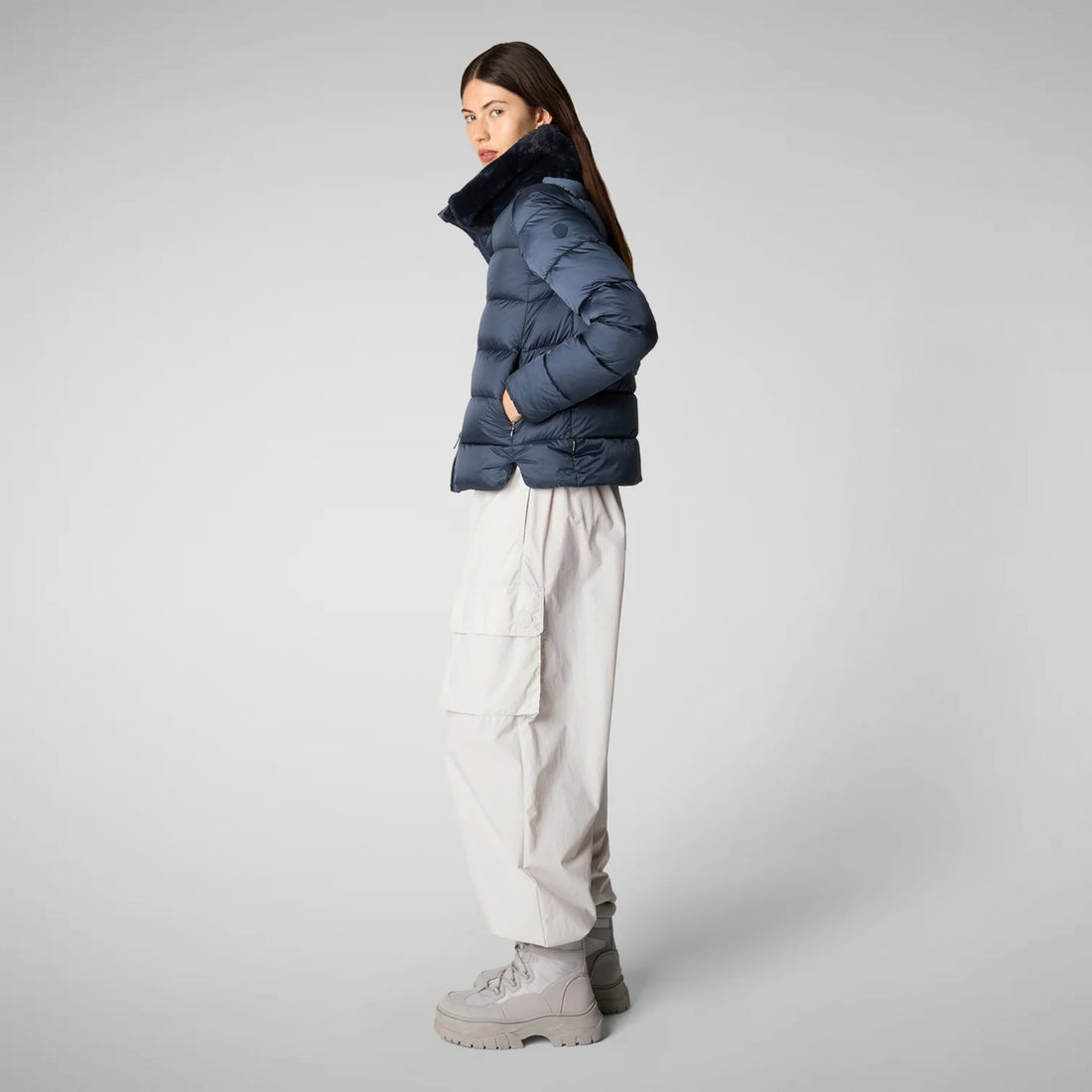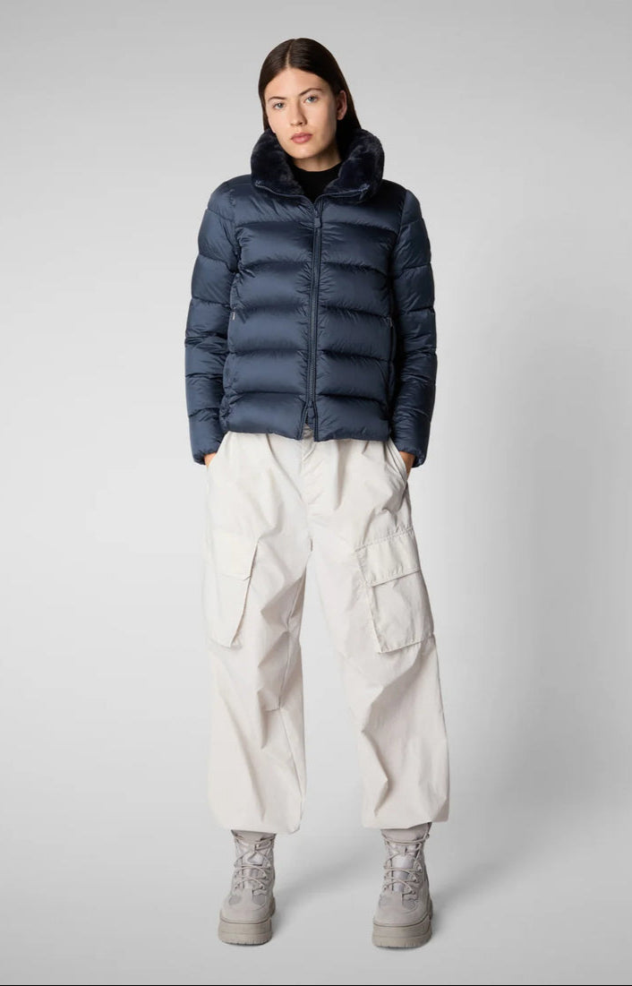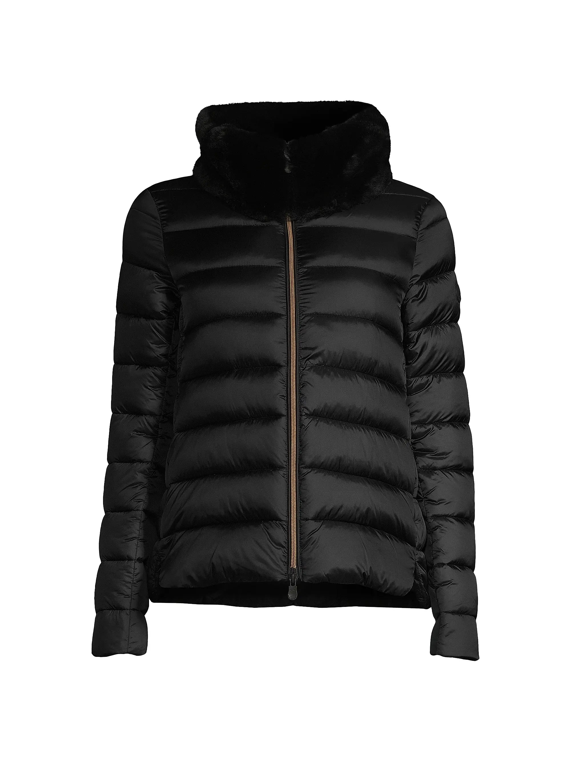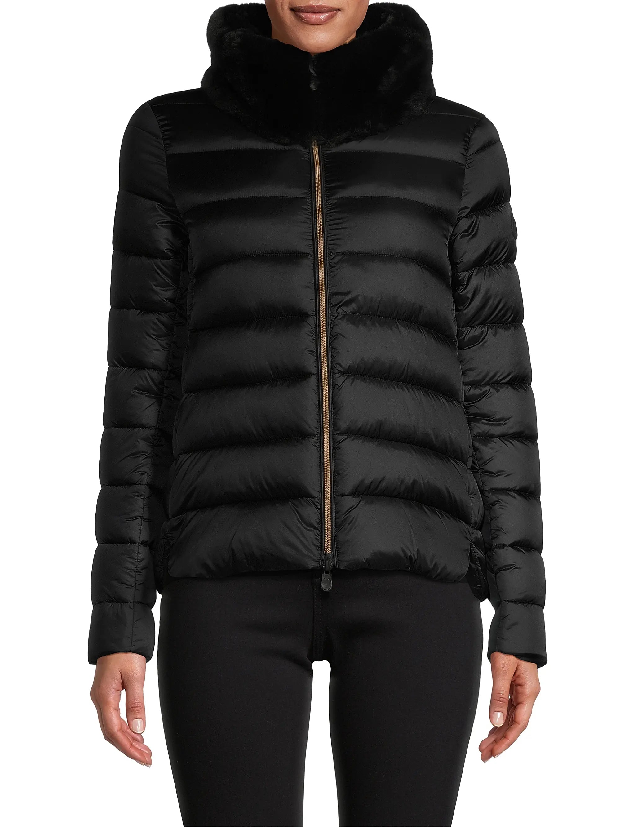 The Mei Puffer Jacket by Save the Duck blends functional design with refined style, featuring channel quilting for an elegant silhouette. Its soft faux fur collar adds warmth and sophistication, while side slit pockets offer practical storage. An easy zip front ensures quick layering, making this jacket a versatile choice for cooler weather.