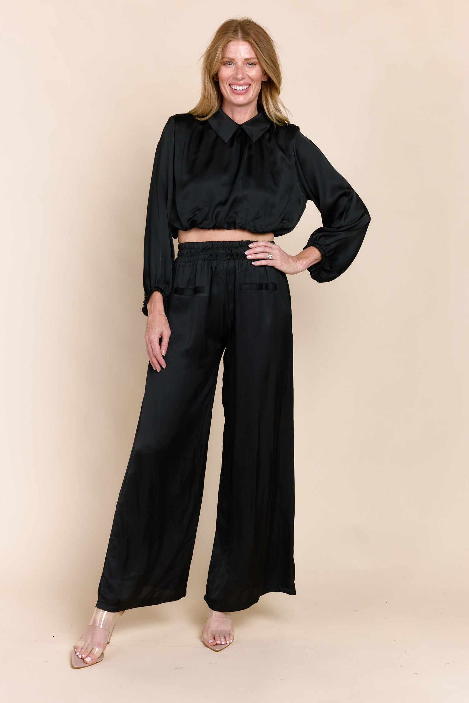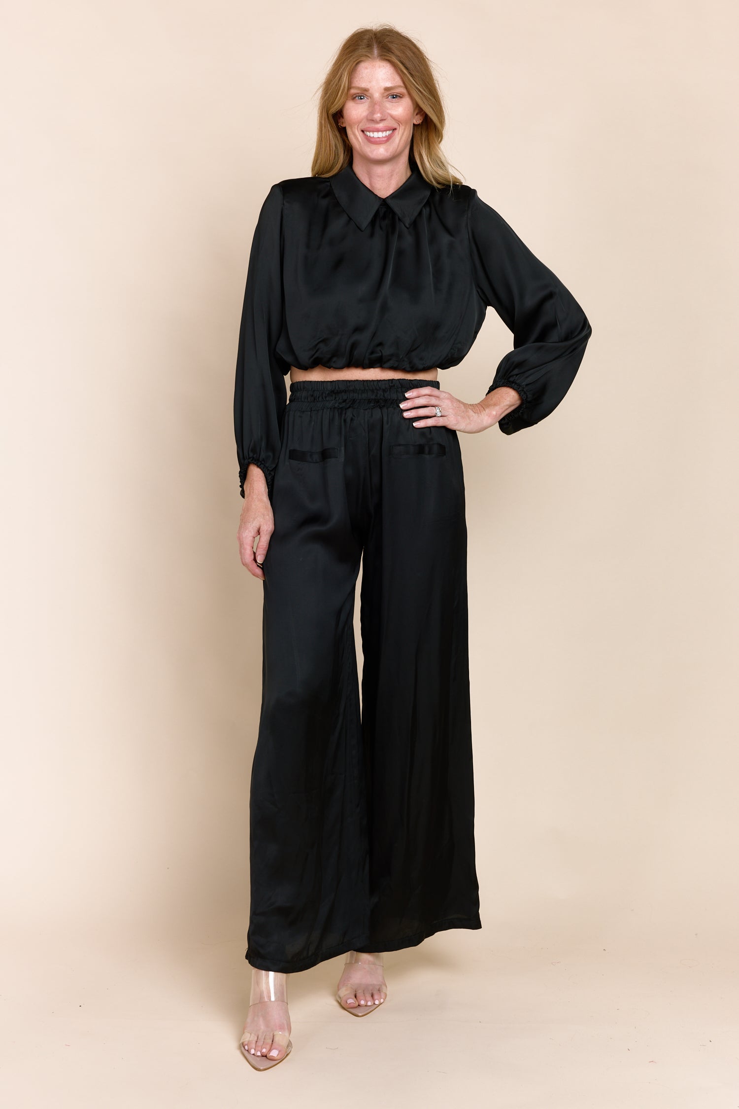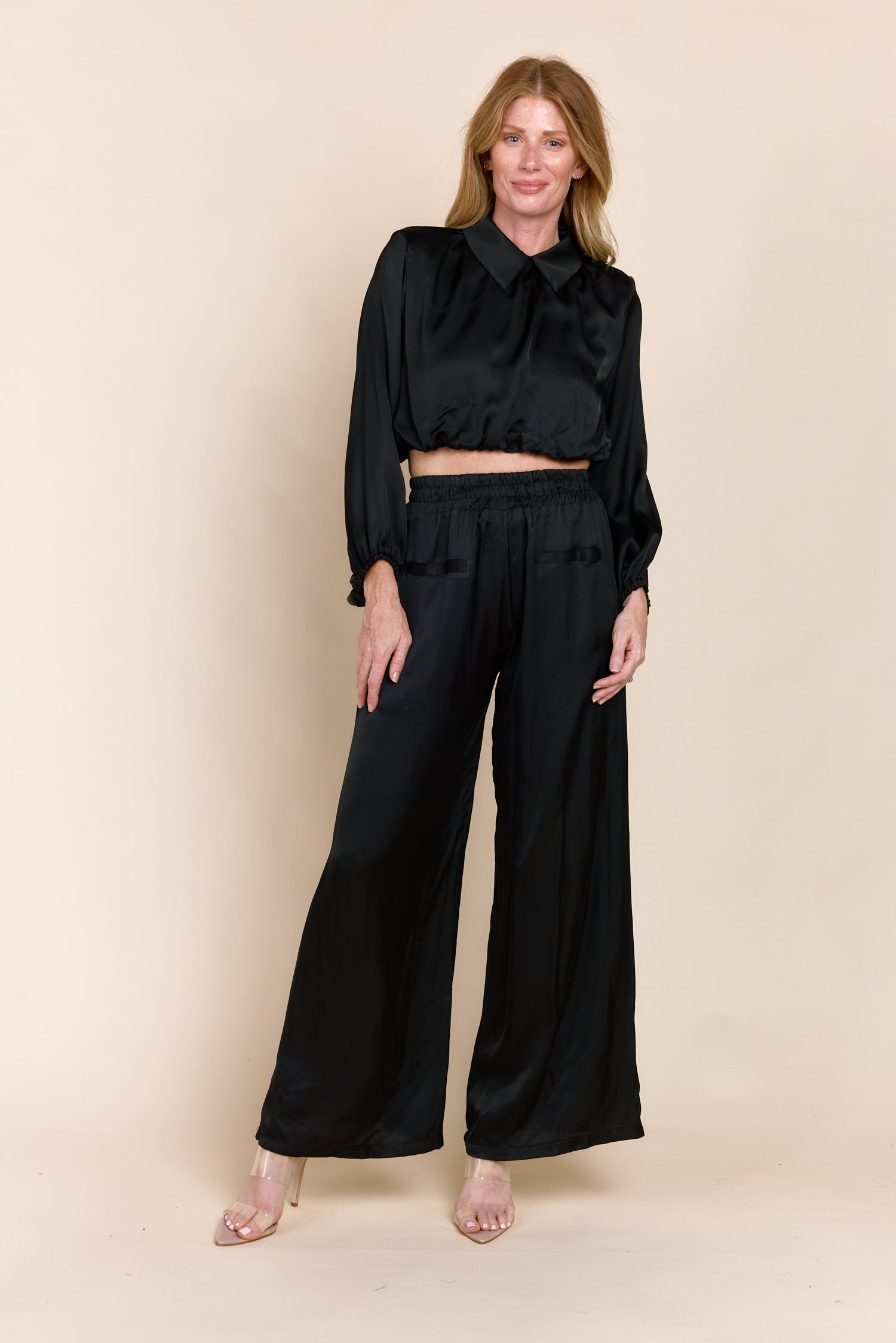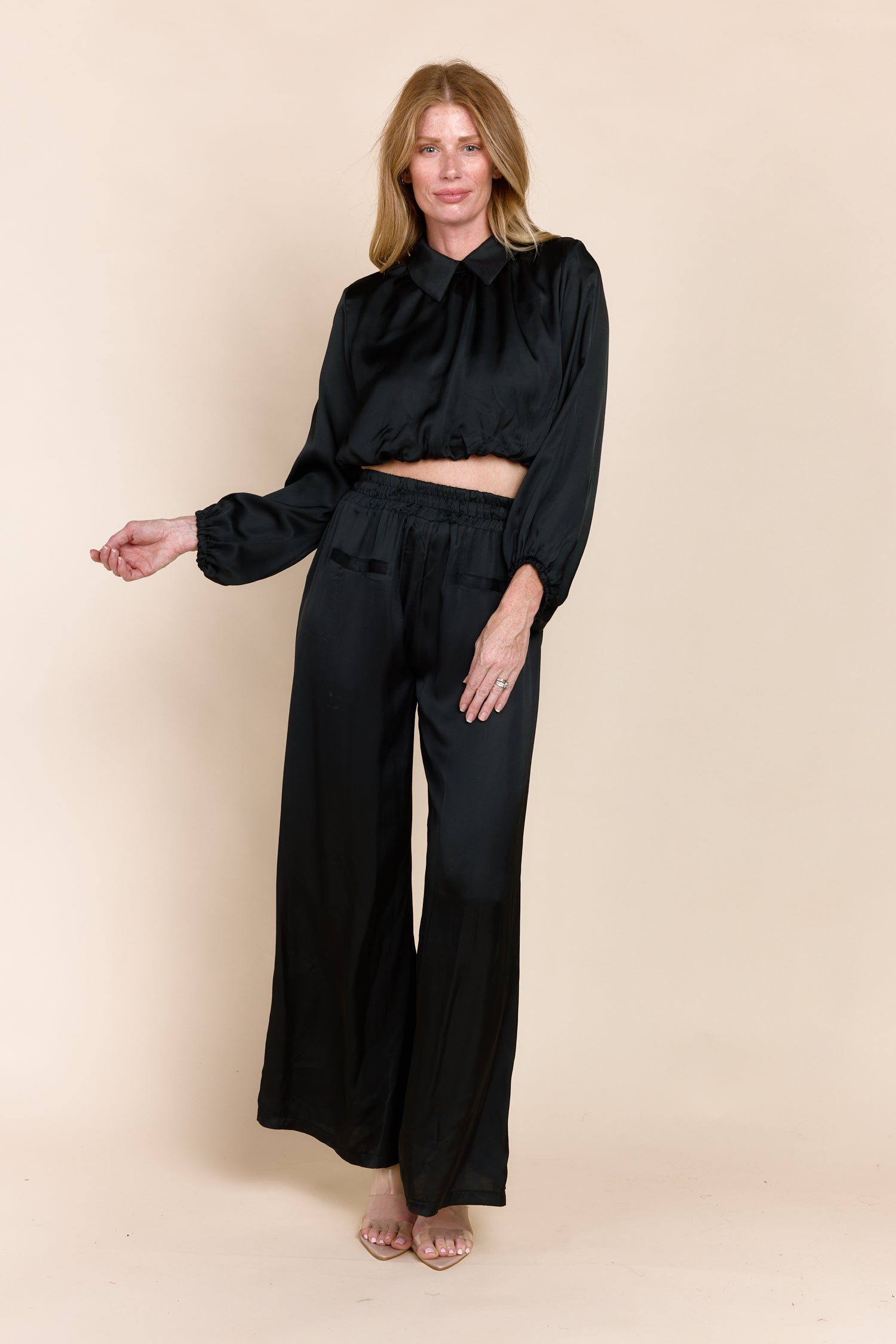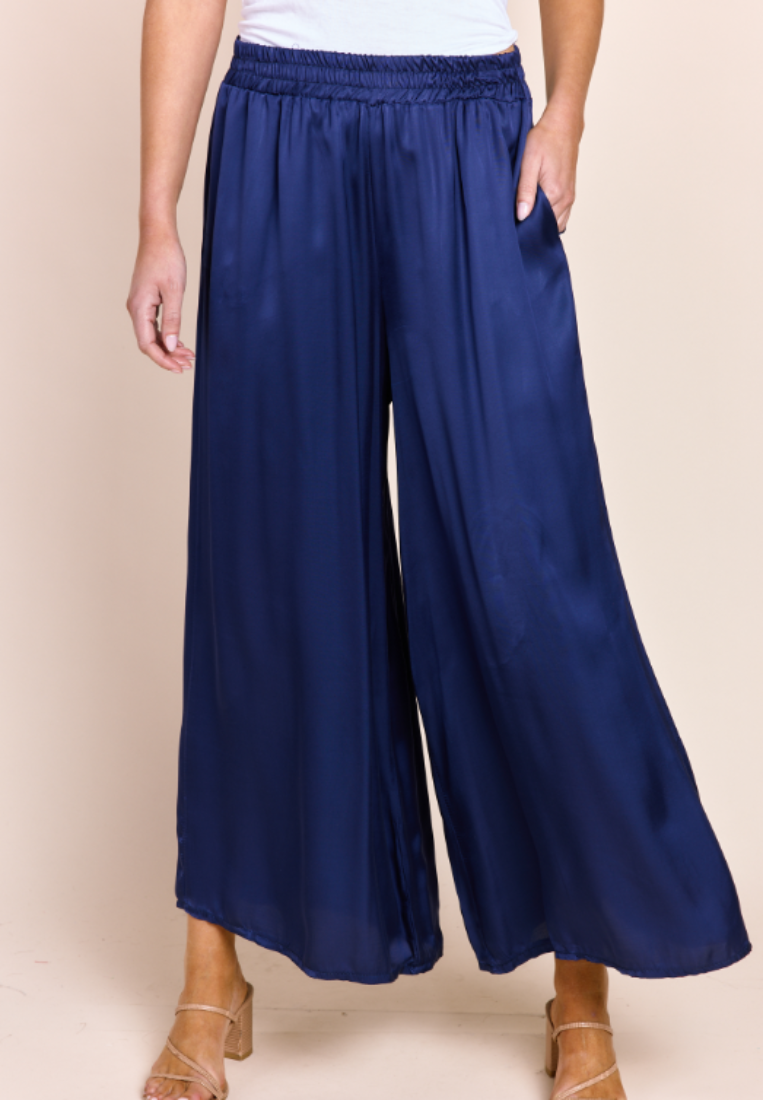 The Amara Pant in Navy combines elegance and comfort with a high-waisted elastic fit and a flowing wide-leg design. Made from soft, breathable Italian silky satin, these pants offer a flattering silhouette that suits diverse body types.