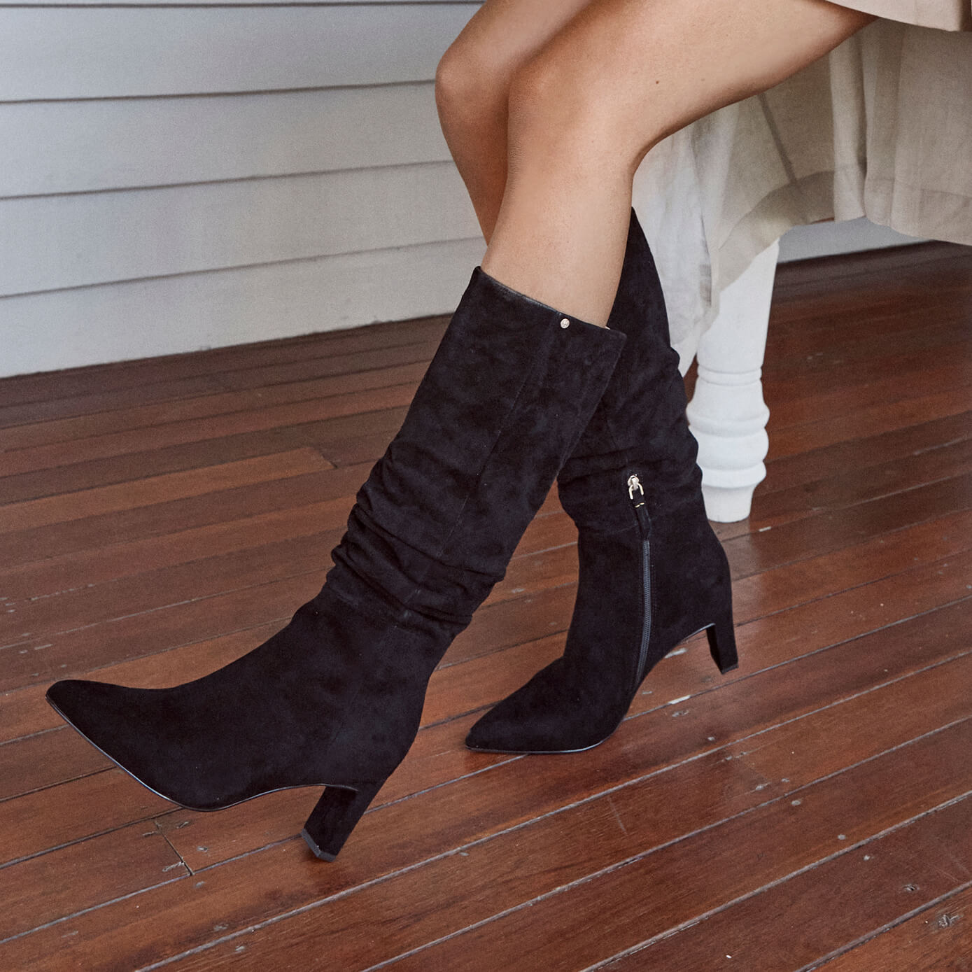 Undeniably chic and fitted with unrivalled comfort, AVA Black has it all. Handcrafted with silk-soft goat suede, she’s set atop a height-of-comfort high heel. Versatility at its best, this trans-seasonal style can be pushed down for a slouchier silhouette and teams well with denim to midi dresses.