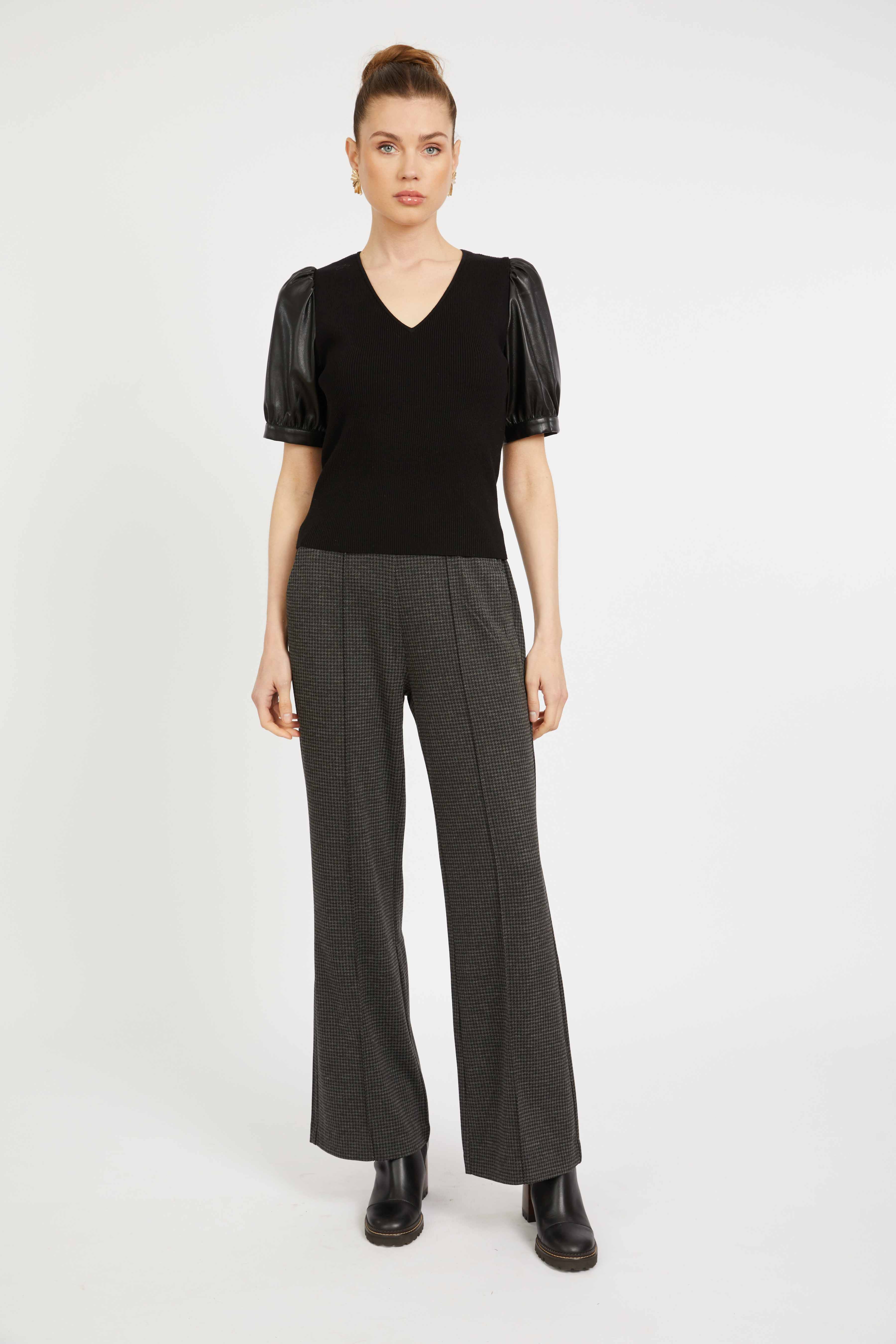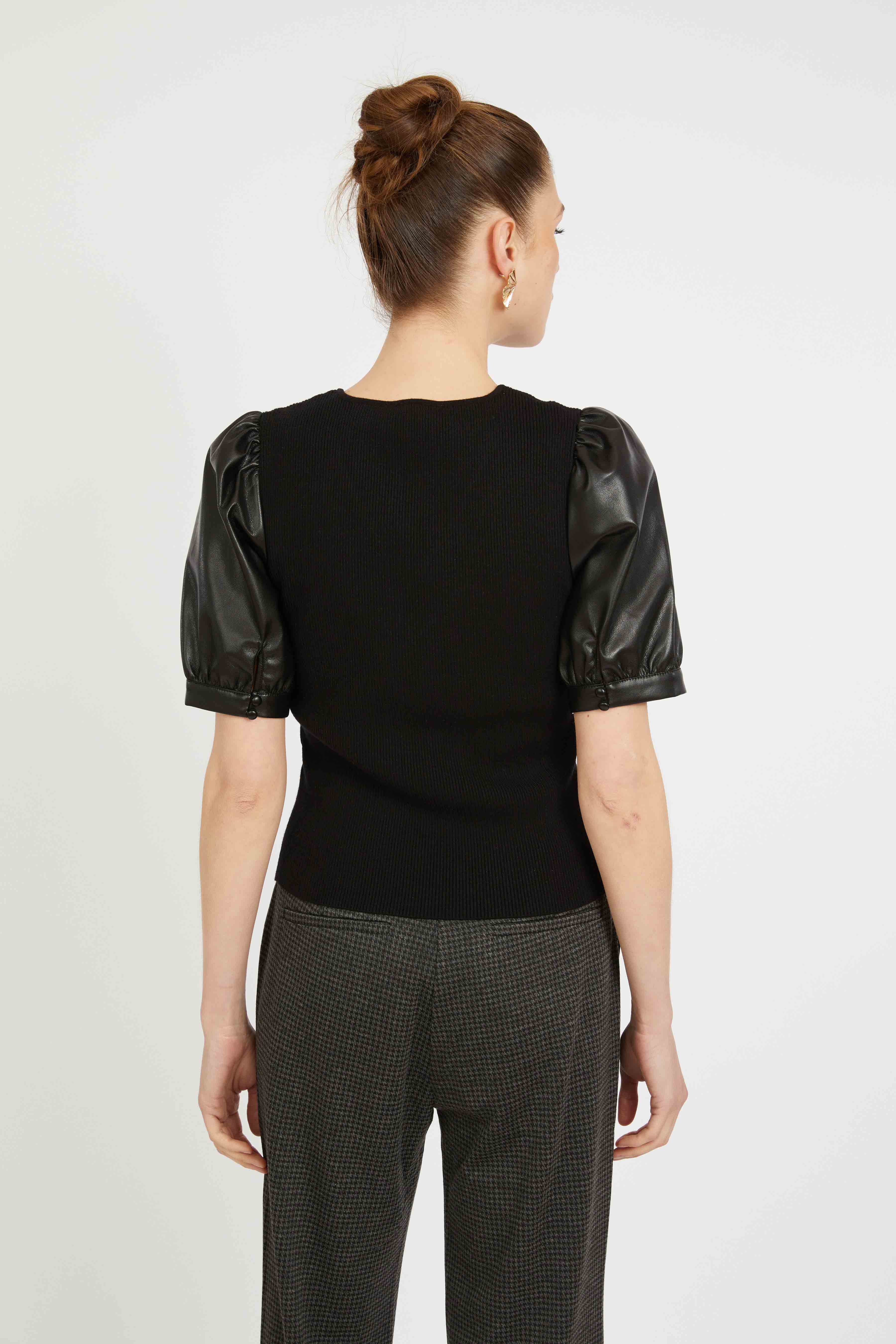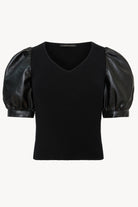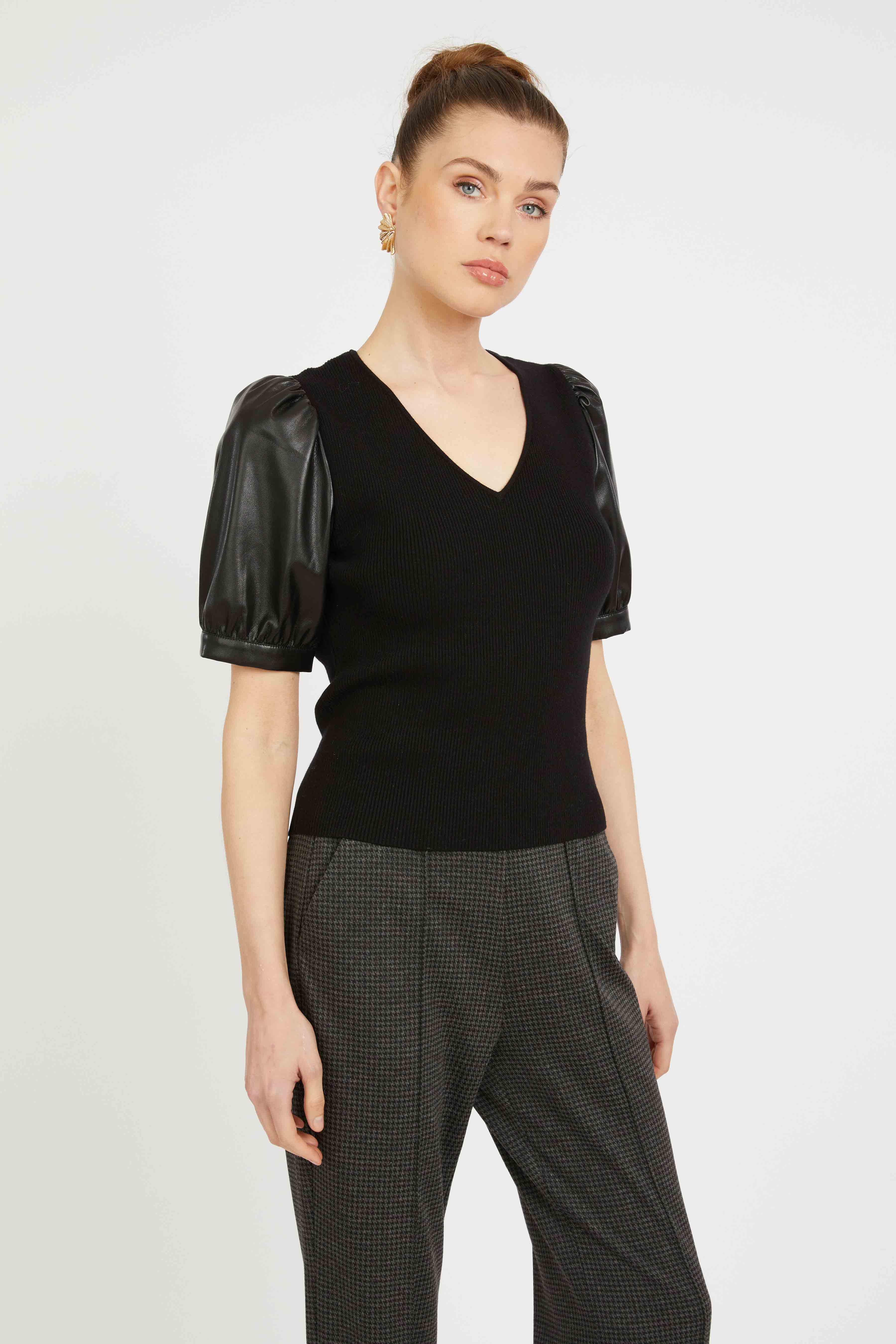 The Andrea Top returns with a contemporary twist, featuring vegan leather sleeves that introduce an edgy contrast to its soft, stretchy knit body. The flattering V-neckline and short sleeves make it an ideal choice for fall layering. Designed to contour comfortably while allowing ease of movement, this top elevates everyday style with a modern, refined silhouette suitable for various occasions.