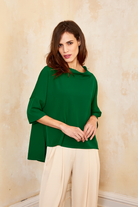 The Audrey Top in emerald green features a structured cowl neck paired with flattering peplum sleeves, creating a refined silhouette. Its hi-low hem adds a modern touch, balancing sophistication with casual ease. Perfect for adding a playful yet polished element to your everyday wardrobe.