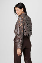 The Beatrix Long Sleeve Collared Button Front Top combines refined tailoring with textured lace for a sophisticated yet contemporary look. Its versatile design makes it ideal for pairing with the Stacy Lace Vegan Leather skirt, creating a cohesive monochromatic ensemble that balances elegance and modern style.