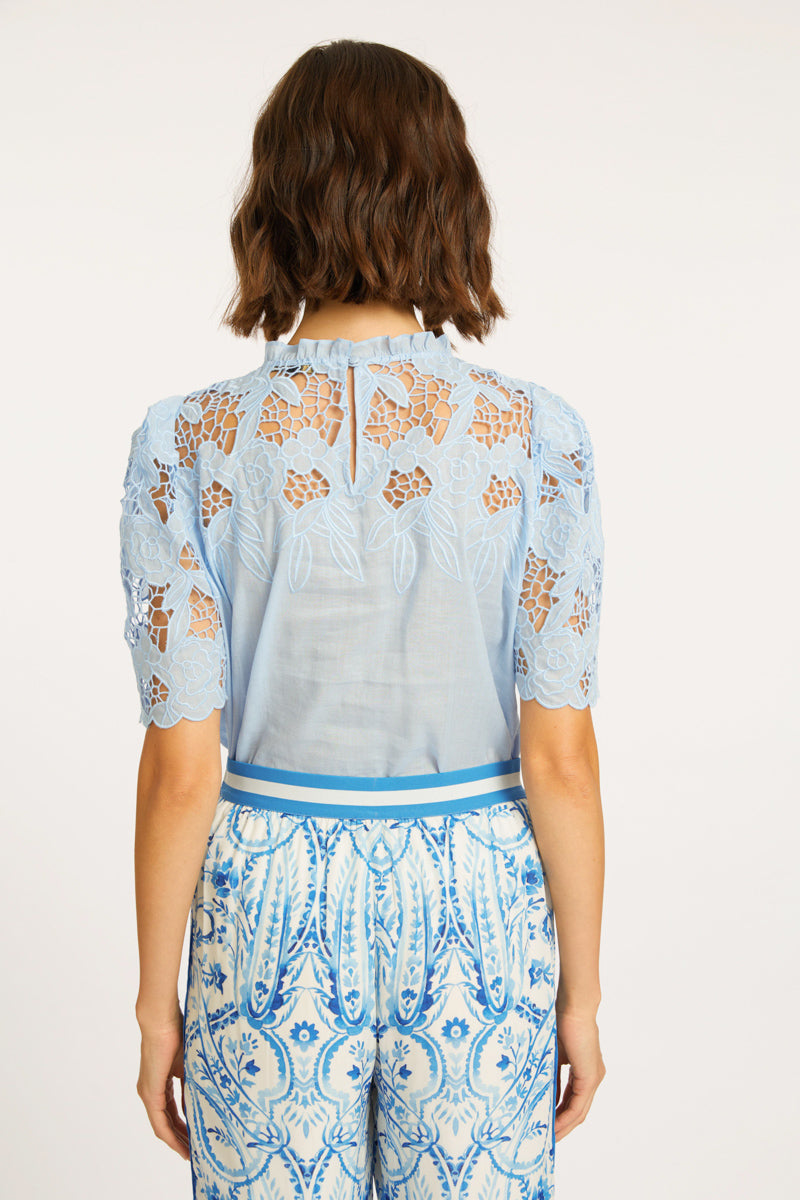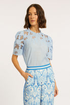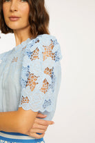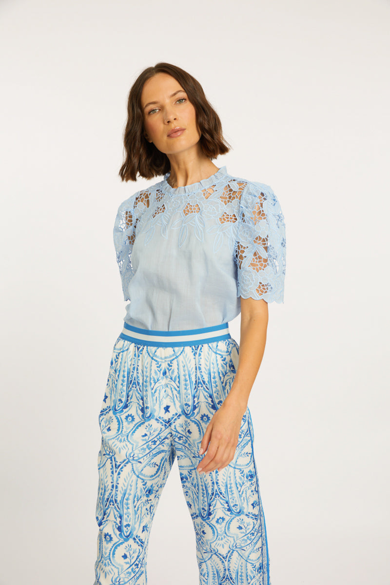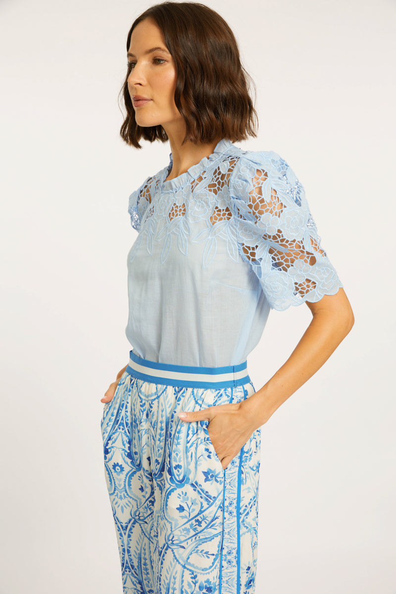Take on a playful elegance with the Katia Top. Crafted from a soft blend of ramie and cotton, this exquisite blouse boasts short sleeves adorned with beautiful guipure lace. Its structured yet soft feel is enhanced by a crew neckline, perfect for tucking into your favorite bottoms.