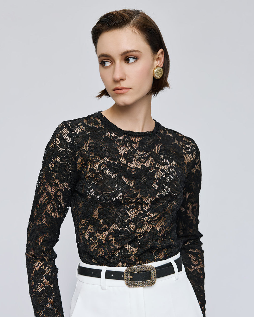 This fitted black lace blouse with long sleeves offers an elegant foundation perfect for layering. Its delicate lace fabric adds texture and sophistication, making it a versatile piece to enhance both casual and formal outfits with effortless style.