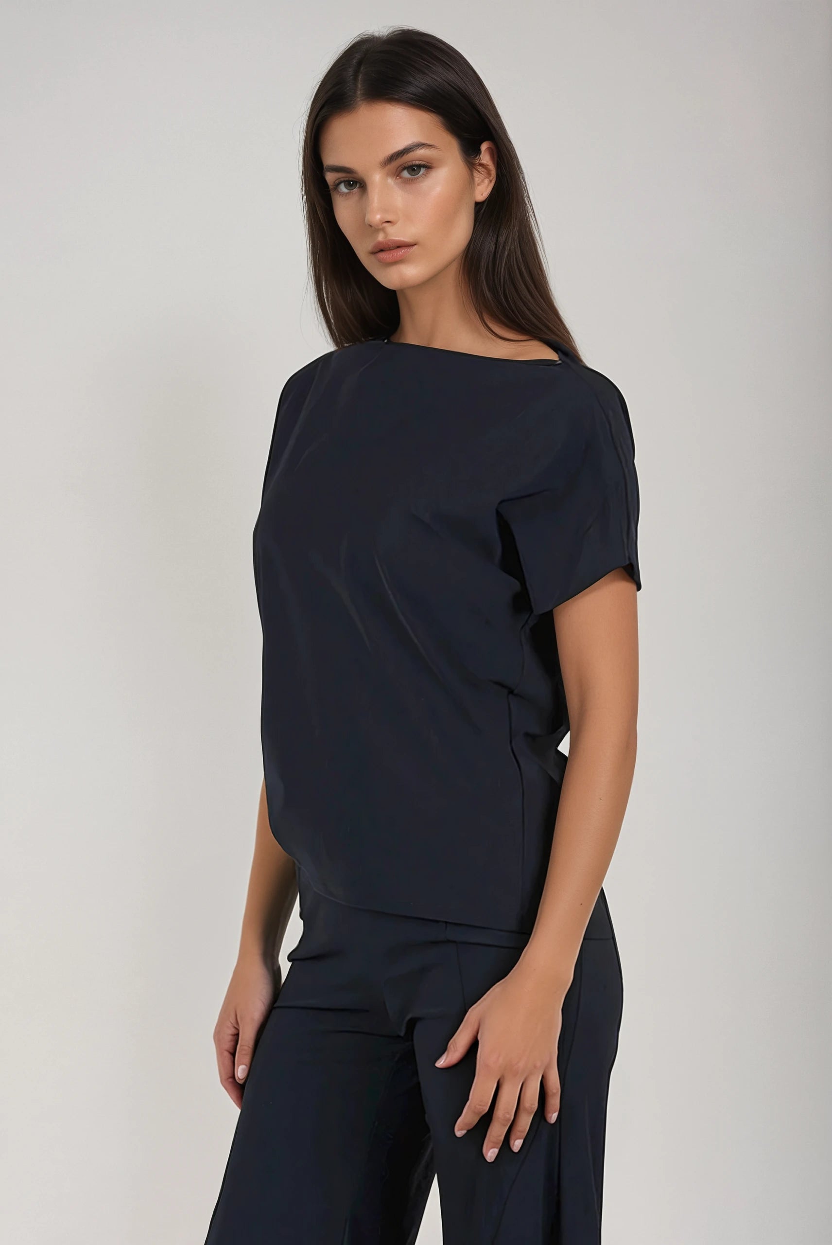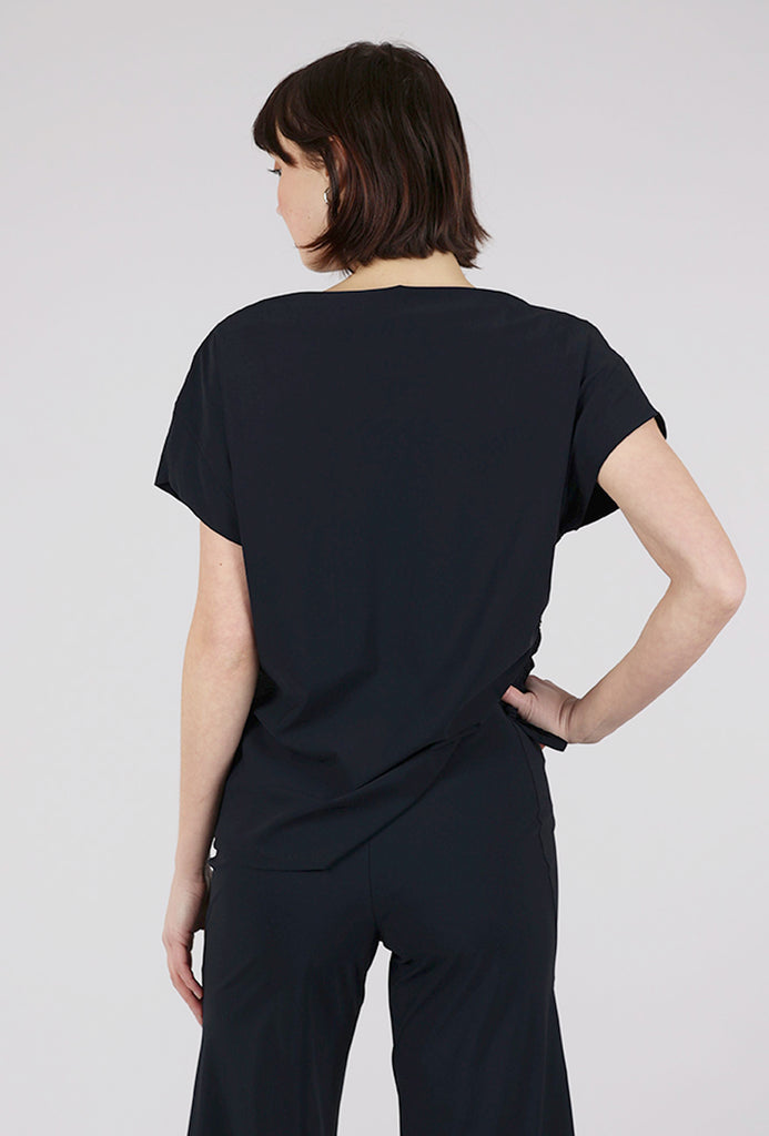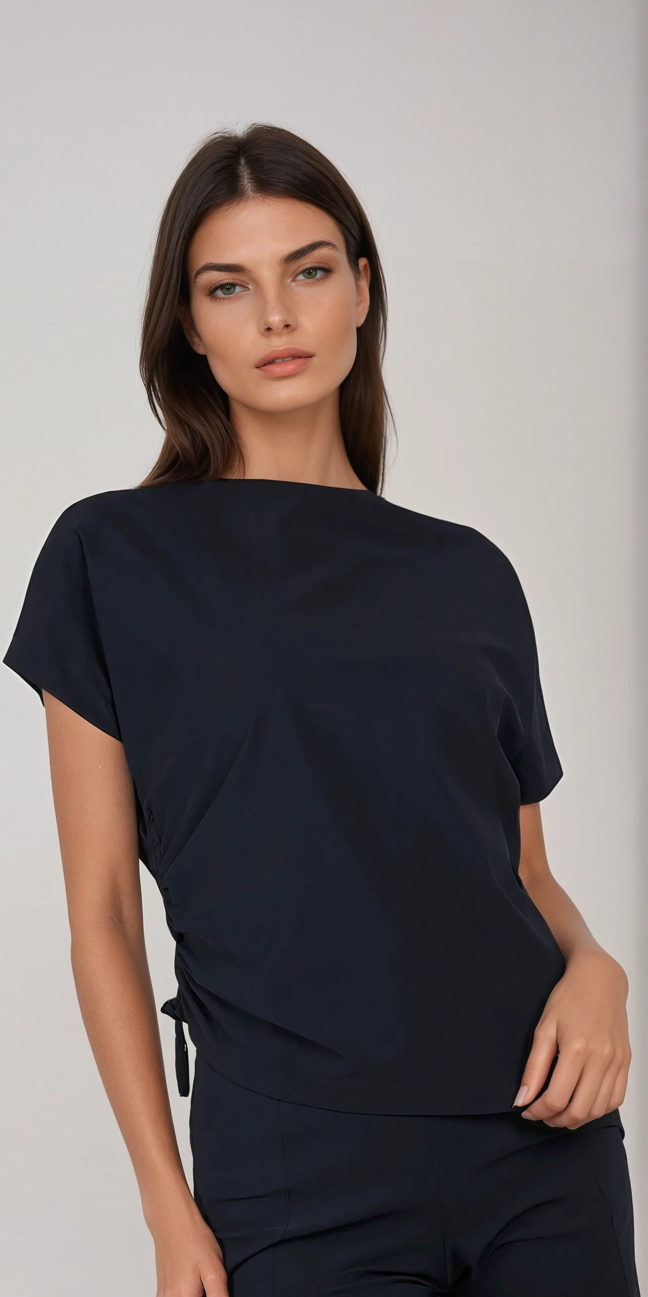 The Mondrian Top in Shadow is a sophisticated spring addition from Porto, featuring a draped boat neckline and short Dolman sleeves for a relaxed yet refined silhouette. Its loose fit is enhanced by a drawstring side gather, allowing for adjustable cinching that creates an asymmetric hemline.