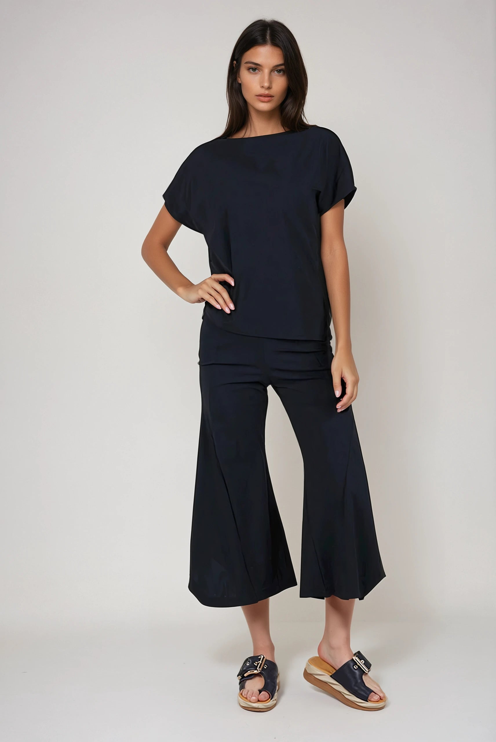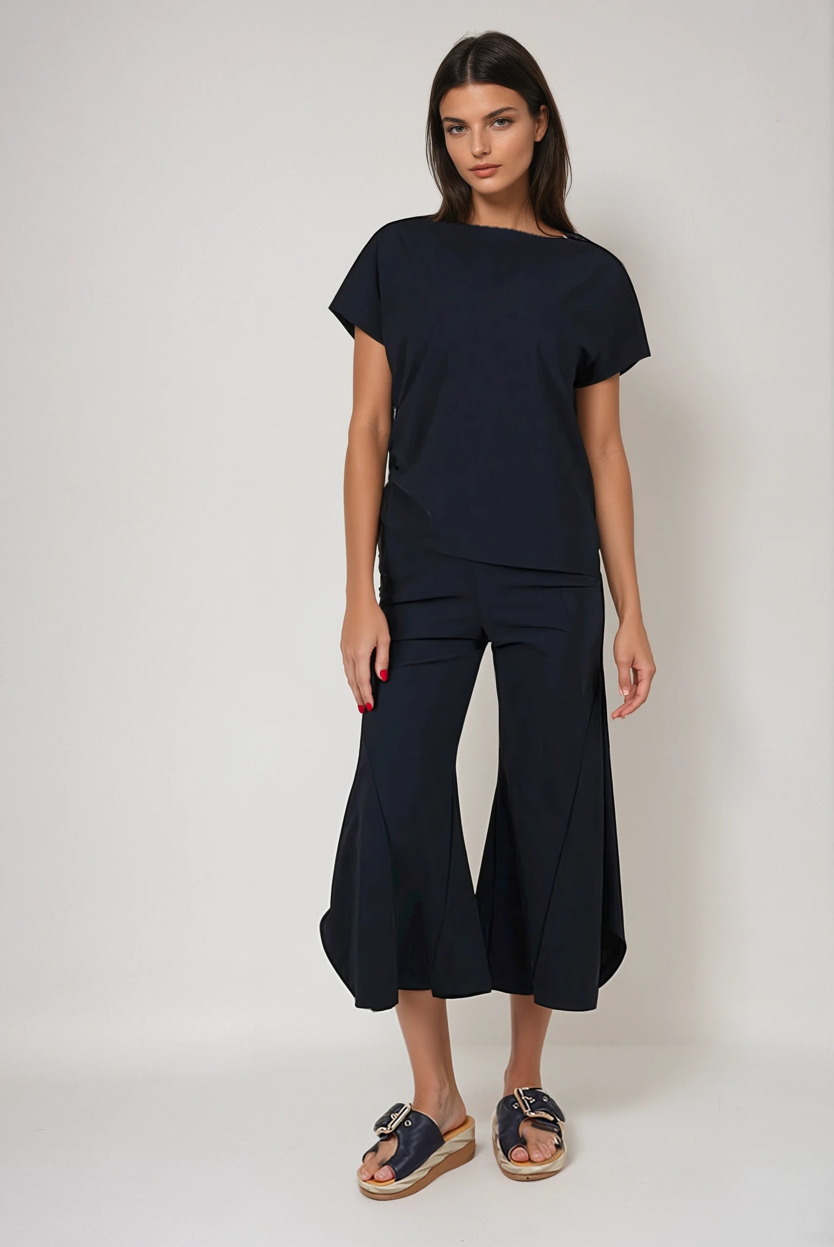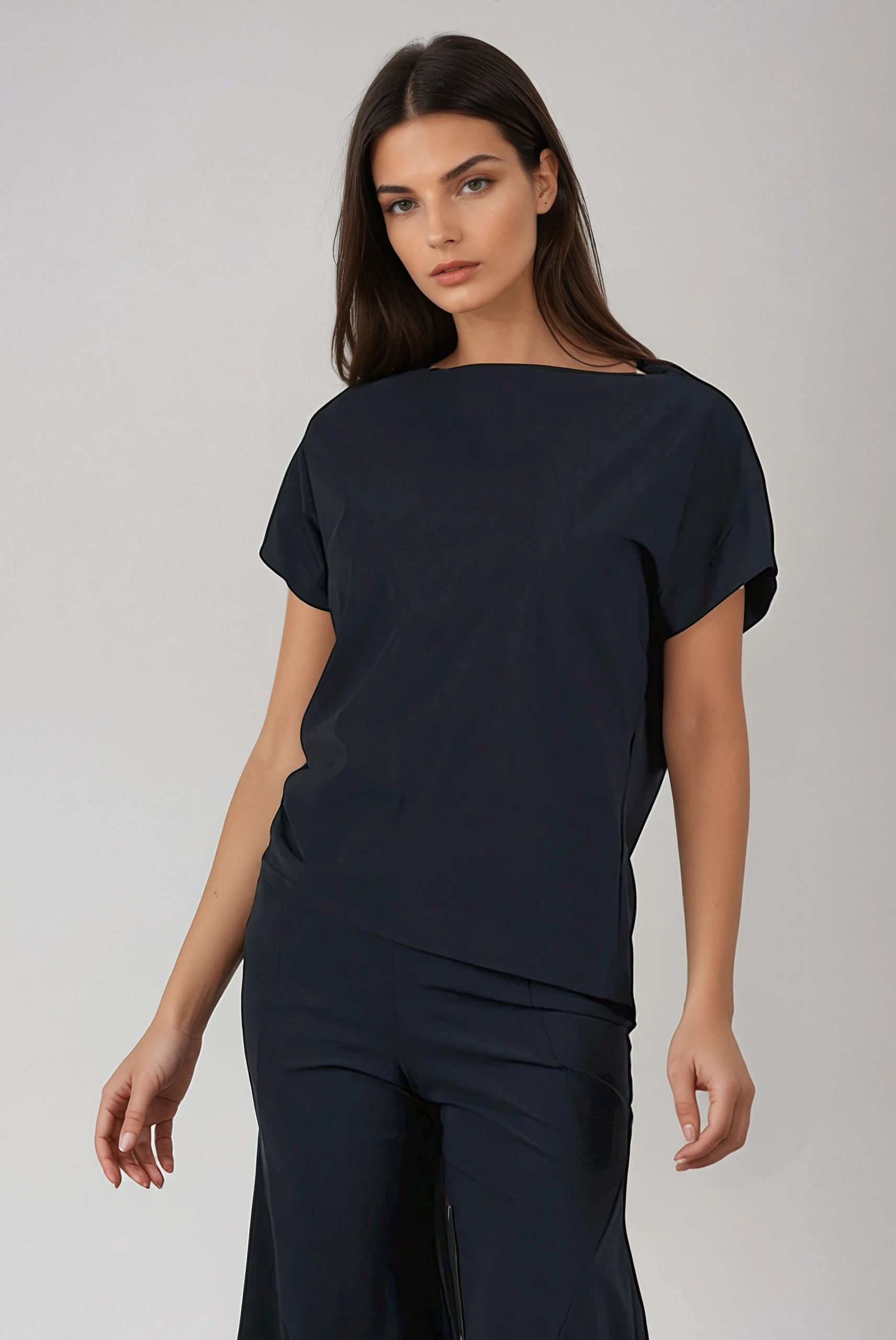 The Mondrian Top in Shadow is a sophisticated spring addition from Porto, featuring a draped boat neckline and short Dolman sleeves for a relaxed yet refined silhouette. Its loose fit is enhanced by a drawstring side gather, allowing for adjustable cinching that creates an asymmetric hemline.