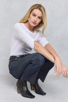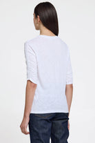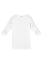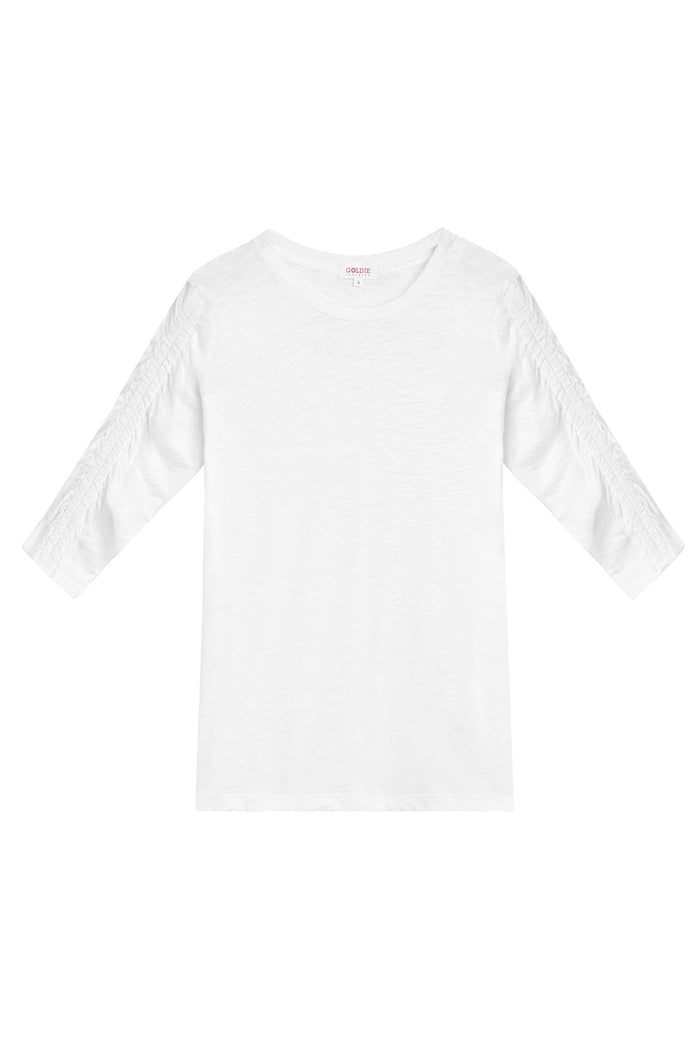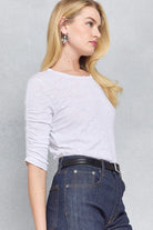 This white crew-neck tee combines silky-soft fabric with ruched half sleeves, creating a refined yet comfortable piece. Its subtle detailing enhances your silhouette, making it a versatile staple for a polished, effortless style.