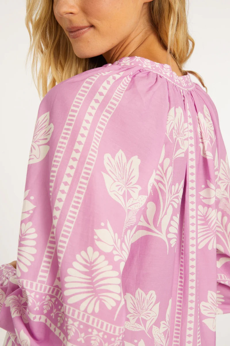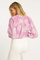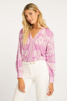 The Sophie Top in the Palm Serenade print offers a blend of relaxed comfort and tropical flair. This long sleeve top features blouson sleeves with functional cuffs, allowing for a flattering and adjustable fit. The comfortable silhouette is complemented by a V-neckline, adorned with delicate blanket stitch detail that adds a subtle, handcrafted touch.
