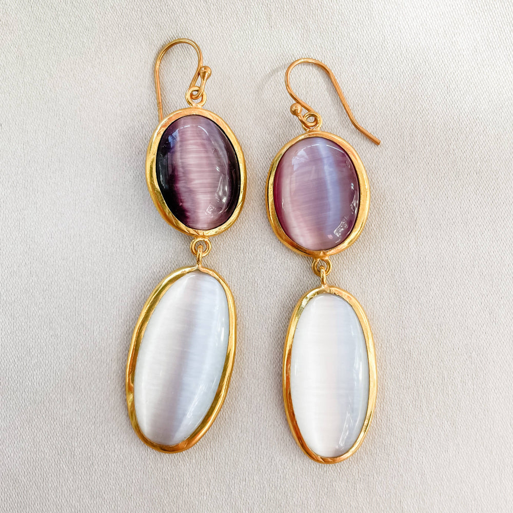 These Color Block Earrings feature elegant dusty rose pink and white cat's eye stones, each set in a meticulously handcrafted bezel. The sterling silver French hooks are enhanced with gold vermeil, combining durability with refined style.